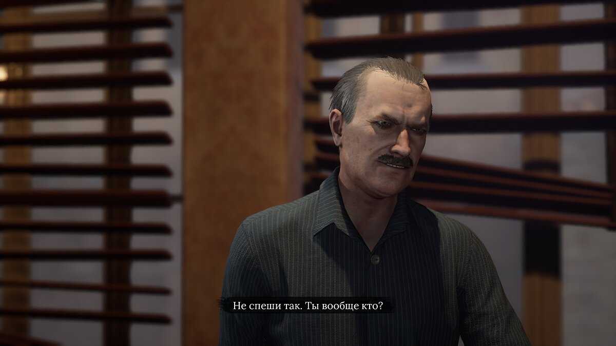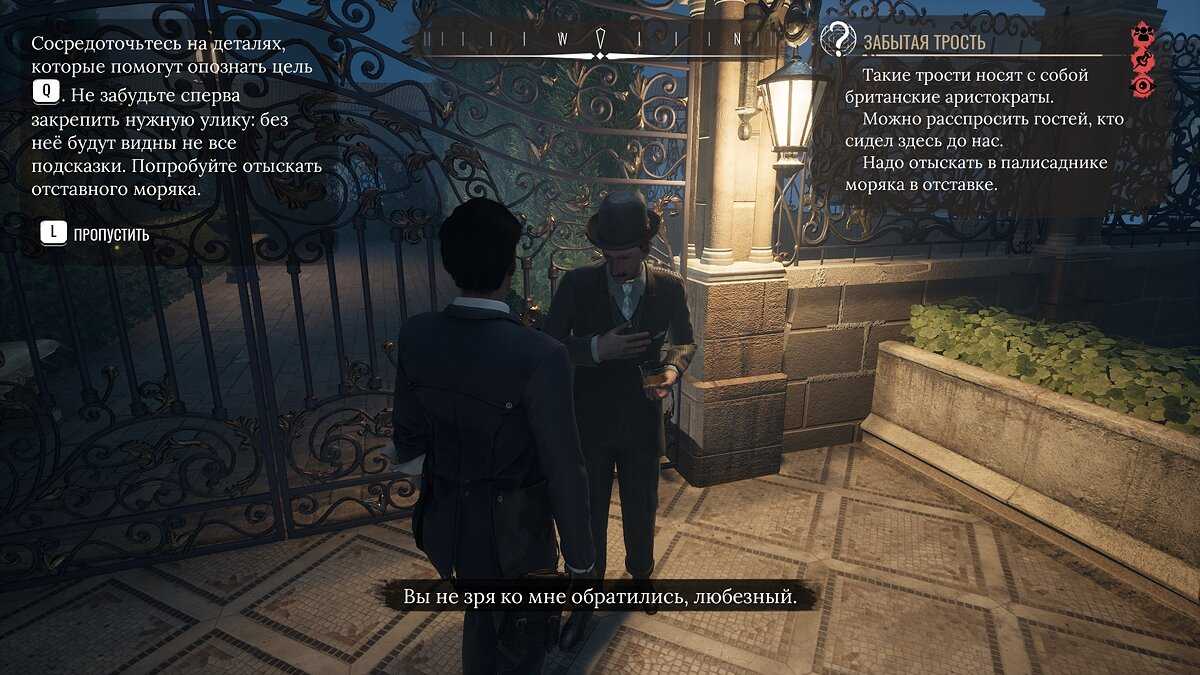 Забираем предмет и после появления подсказки прикрепляем улику в дневнике к метке «Забытая трость». Разговариваем с мужчиной у левого края барной стойки и выходим на улицу.