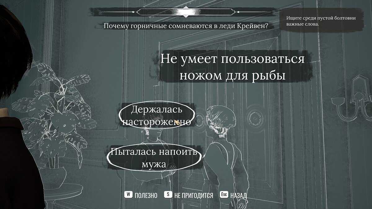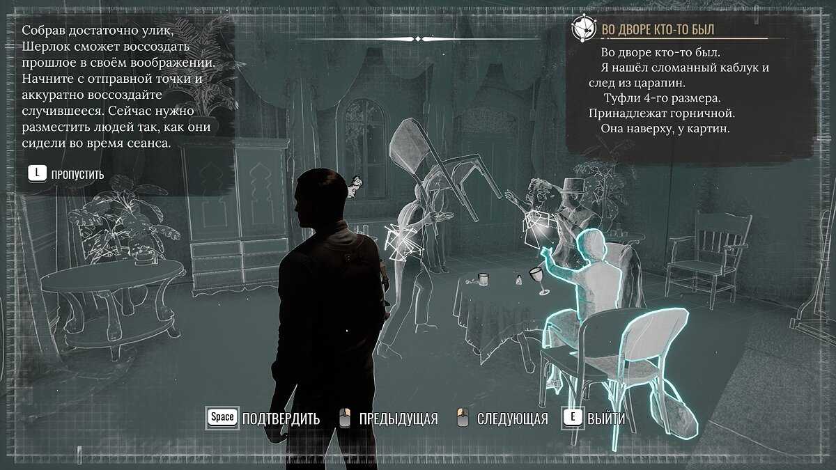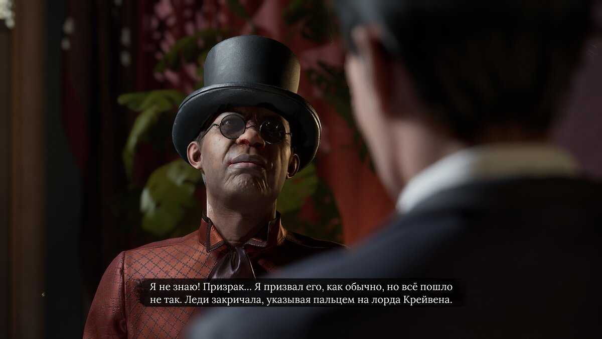 После разговора с англичанином на столе осматриваем эктоплазму, разбитый бокал, бокал с виски, брошь на куртке, а также предмет в центре при помощи способности. Изучаем стул у двери и девушку на кушетке, а затем разговариваем с медиумом. Открываем чертоги разума, соединяем две улики про леди Крейвен и отправляемся во двор. Используем способность и возле окна осматриваем сломанный каблук.