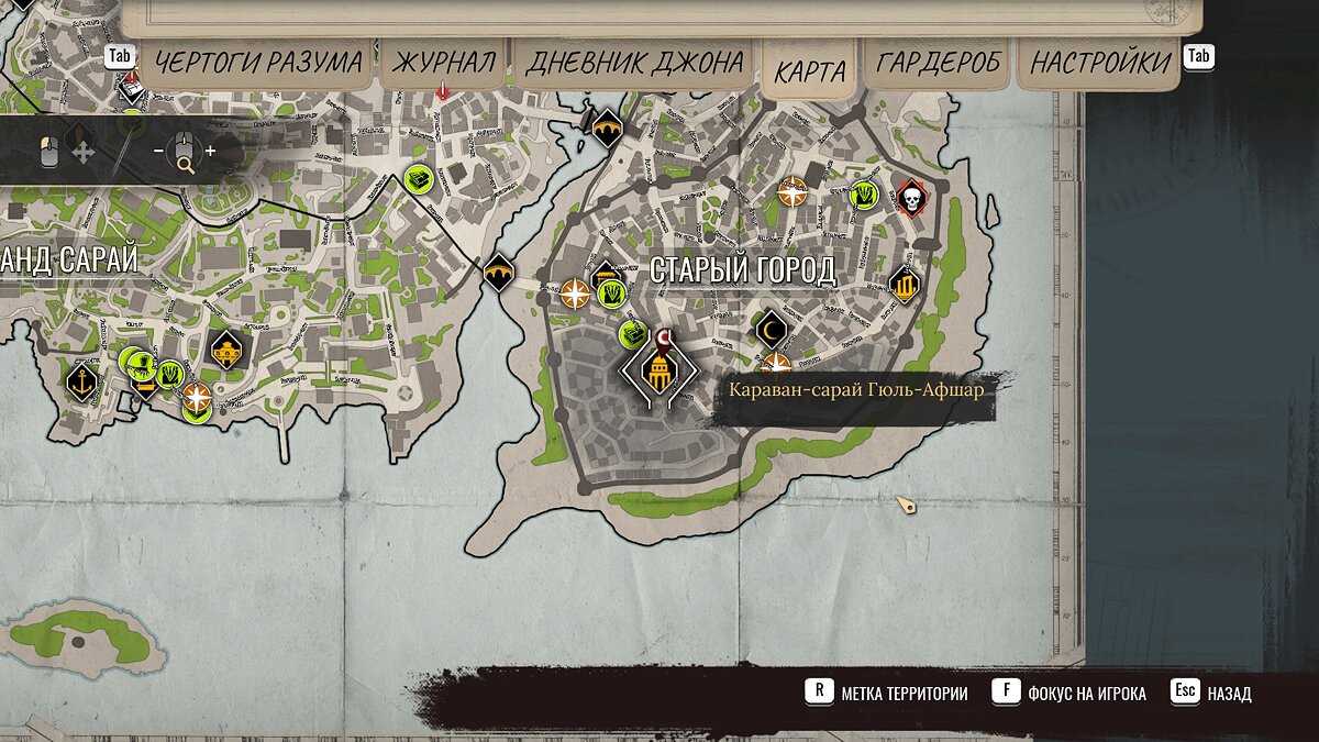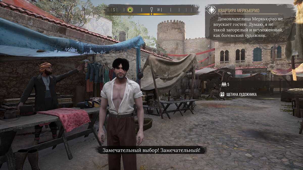 Находим подсказку и отправляемся на рынок в Старый Город. Следуем к указанной на скриншоте выше точке и разговариваем с девушкой внутри дома. Следуем к ближайшему торговцу и меняем стиль Шерлока: