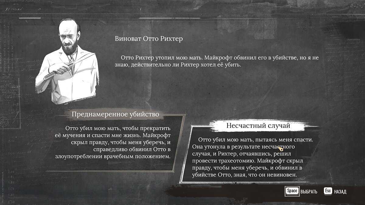 После короткого видеоролика делаем финальный выбор и указываем на случившееся. В игре доступно четыре концовки. Две из них связаны с Отто Рихтером, а ещё две с Шерлоком: