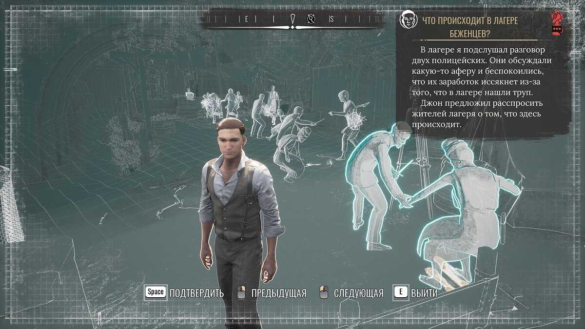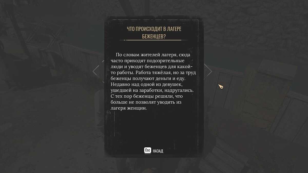 Следуем к указанному на скриншоте выше месту и разговариваем с полицейским. Допрашиваем его и выбираем понравившийся портрет. Проходим по прямой в лагерь беженцев и осматриваем восемь табличек с уликами, раненного мужчину и труп. Подслушиваем разговор полицейских и выбираем варианты «Лагерь могут закрыть», «Забирают беженцев» и «Деньги».