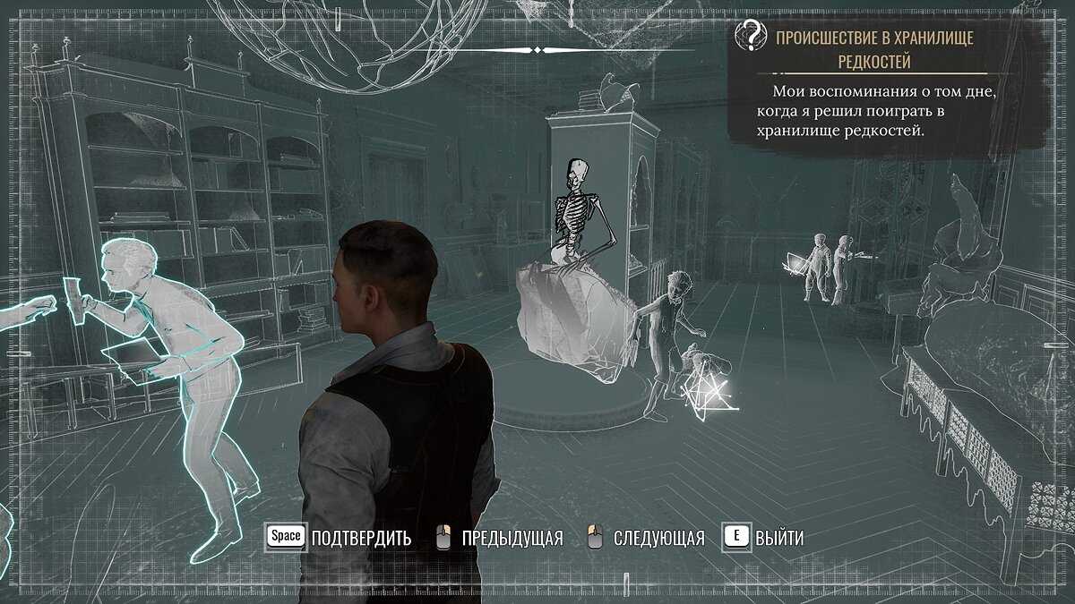 Возвращаемся в семейный особняк. Открываем подарок Фогеля и после разговора с Майкрофтом проходим внутрь дома. Активируем запись «Детали воспоминаний» и при помощи способности осматриваем в главном холле все белые круги. Проходим в дверь направо в комнату с различными трофеями и изучаем каждый из них: головы медведя и оленя, одеяло на столе, копья, книгу на полке, копию священного грааля, доспех, ящики у окна, шлем, саркофаг, фотографию, скелет, стол с карточками, письмами и запертым ящиком.