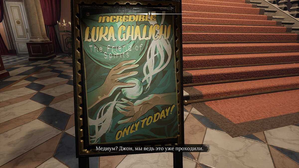 Разговариваем со слугой и спускаемся в вестибюль. Осматриваем рекламную афишу медиума и разговариваем с мужчиной.
