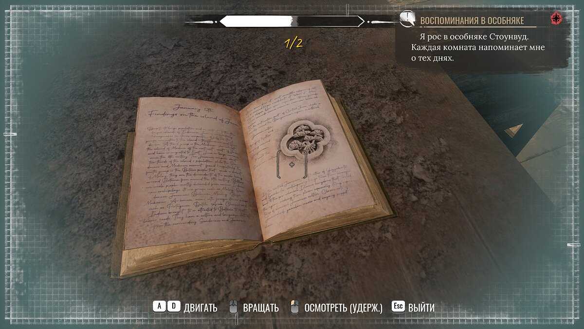 Осматриваем чашку на месте рояля, проходим в комнату и изучаем лекарство. В беседке разглядываем книгу.