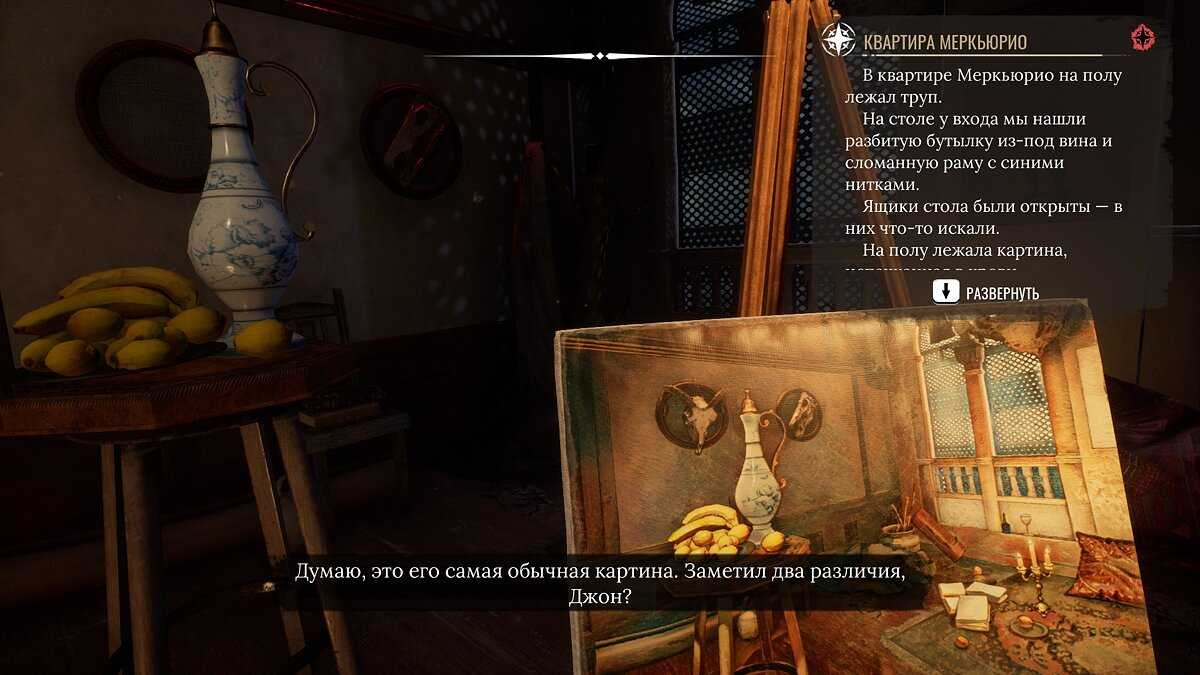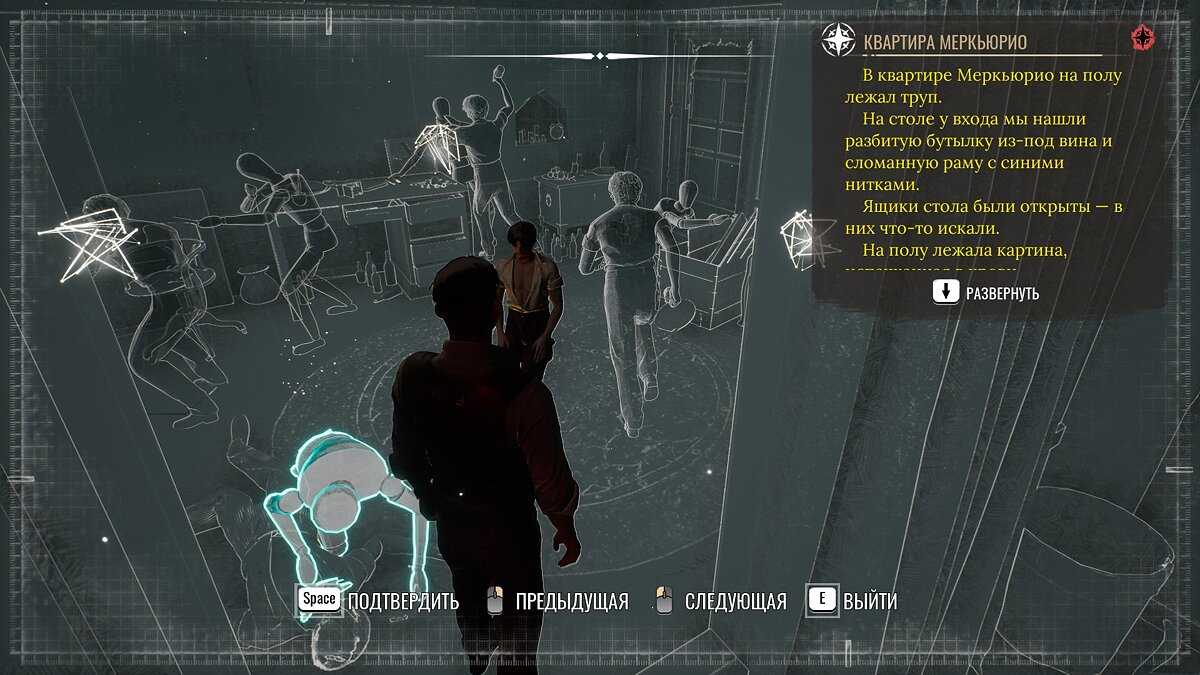 Проходим на второй этаж в квартиру художника и изучаем место преступления: стол, бутылки, сундук, кровать. Осматриваем на теле шею, тряпку, руку, нож и грудь. После появления белого шара восстанавливаем события: