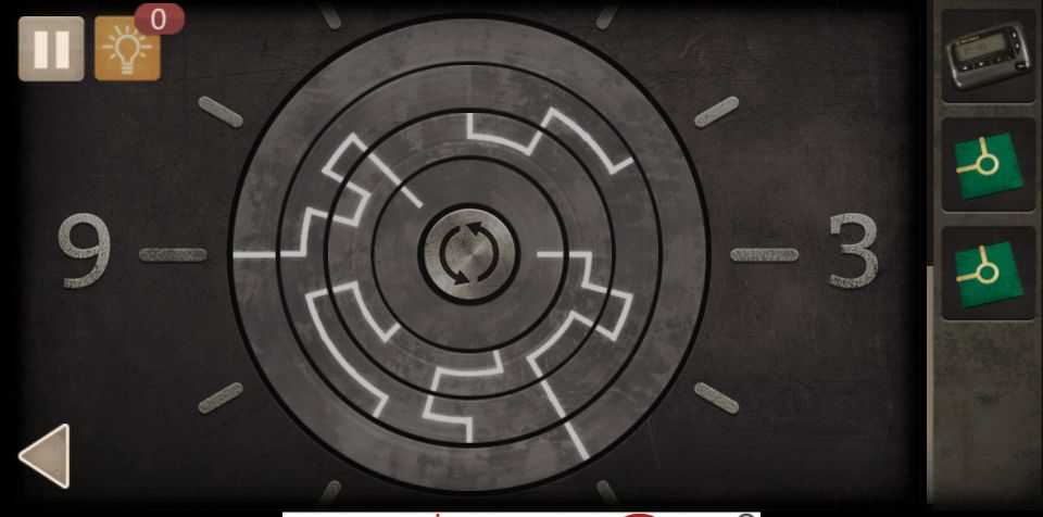 10. Выходим в коридор и подходим к следующей двери от уборной. Здесь нужно открыть замок в котором не хватает детали — кольца которое у нас уже есть. Вставляем и вращениями необходимо выбрать правильную комбинацию. Для подсказки смотрим на пейджер. На нем время 17.45. У вас должно получиться две стрелки на эти значения.