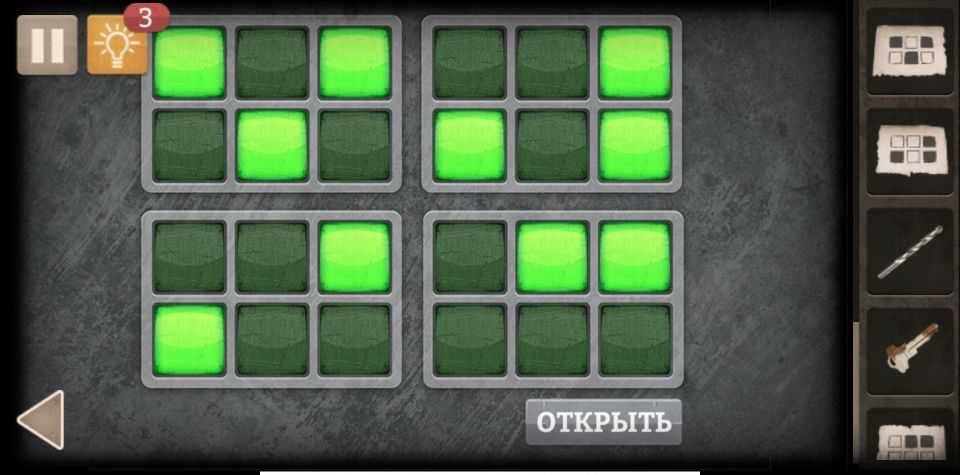 11. Идите в первую комнату, тут находится стол с замком, откройте его используя найденные куски бумаги. Внутри вторая кнопка, тапните
