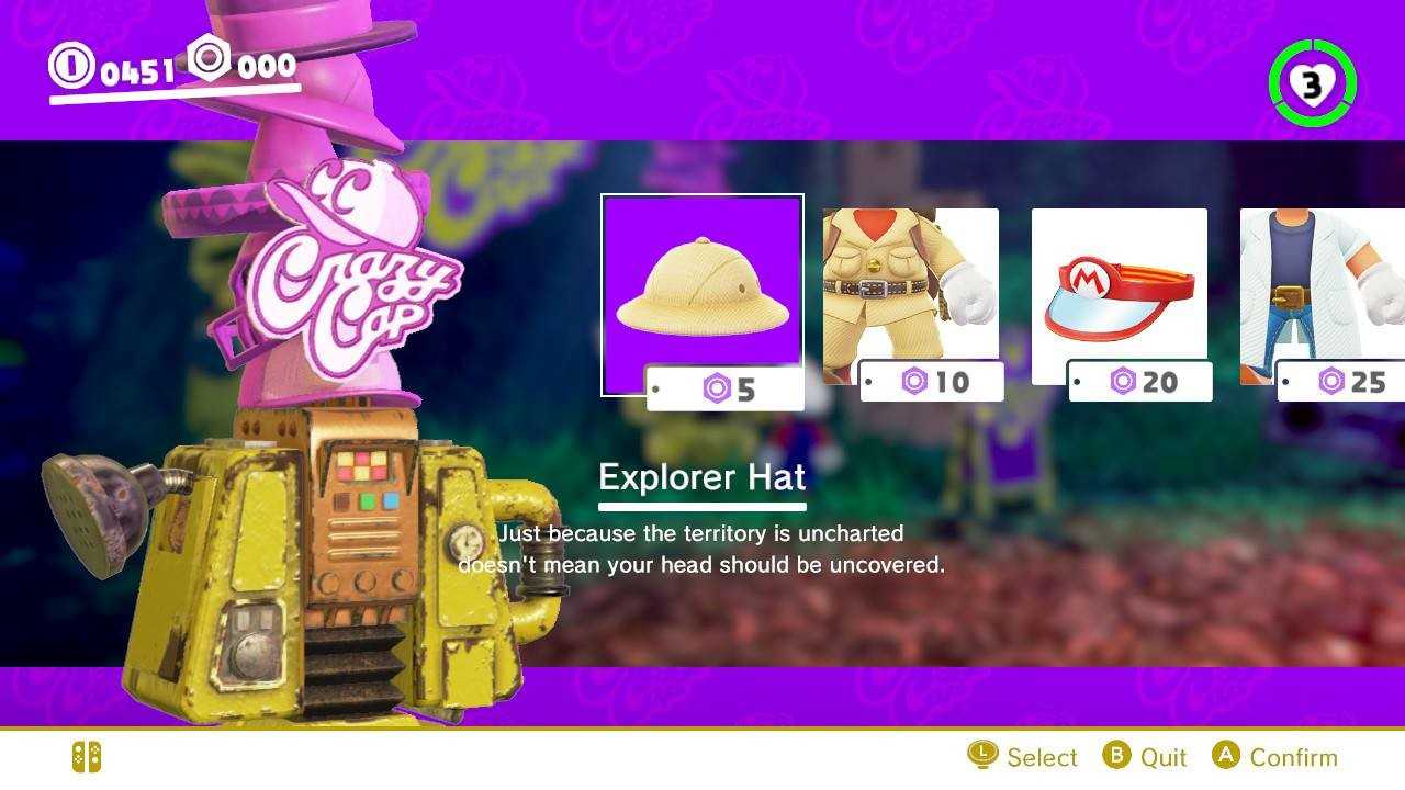 | Покажите вещи, которые может захватить Cappy. | Оставь Марио бездельничать. Белые шляпы появятся над вещами, которые может захватить Cappy. |