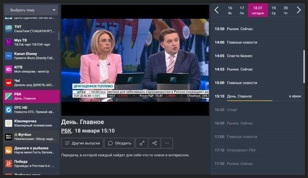 Бесплатно доступны 330 каналов, среди которых эфирные и тематические: развлекательные, новостные, детские. Каналы можно добавлять в “избранное”, есть телепрограмма и собственная медиатека с фильмами, мультфильмами и сериалами. Подписка с дополнительными пакетами стоит от 99 рублей в месяц.