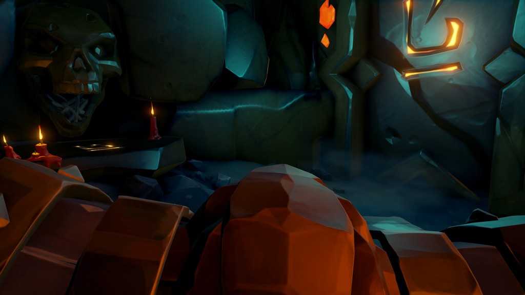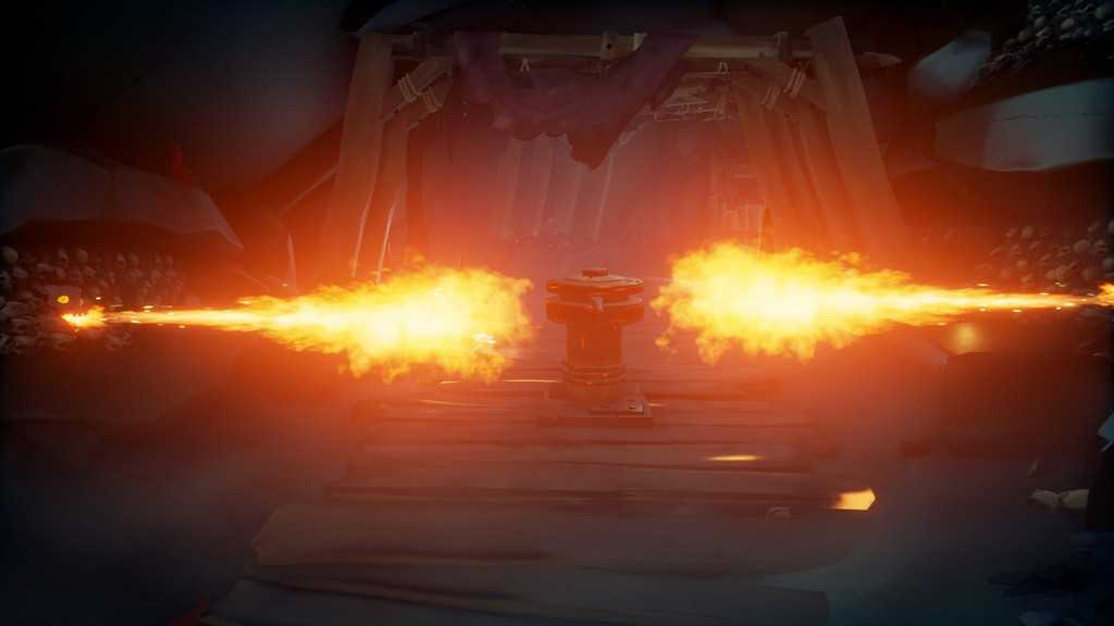 Впереди нас ждёт закрытая дверь. По аналогии с другими, надо бросить огненную бомбу в череп рядом. Закончились бомбы? Не беда! Вы можете поставить радом с черепом сундук, пару раз ударить его, отойти от него и выстрелить, и он взорвётся, поджигая всё вокруг.