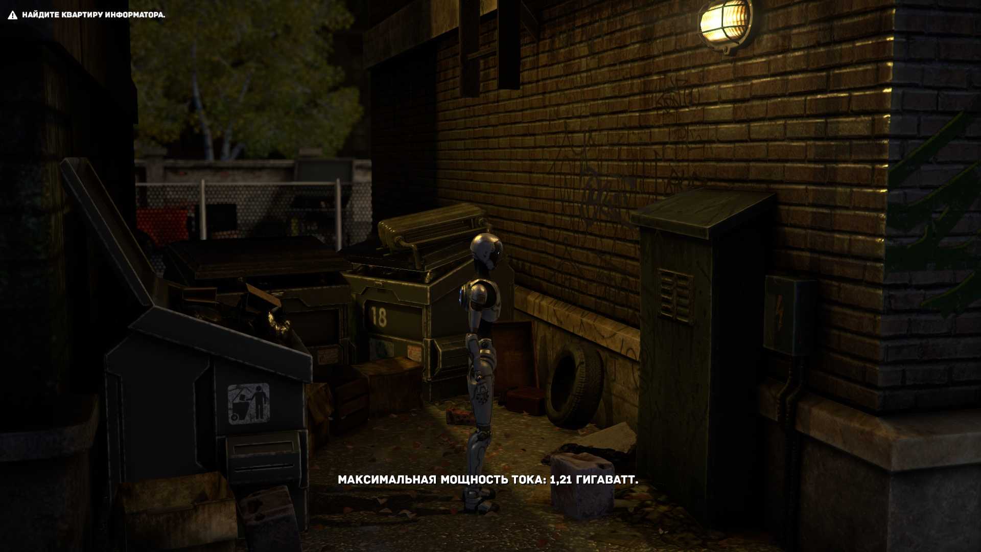 Возьмите кусок кирпича, вернитесь в дом и примените его на трубу. Выбив трубу, идите в переулок и примените её на лестницу. Ар-Ти не достанет до лестницы. Взаимодействуйте с бетонным блоком, чтобы передвинуть его. Вновь примените трубу на лестницу. У вас получится!