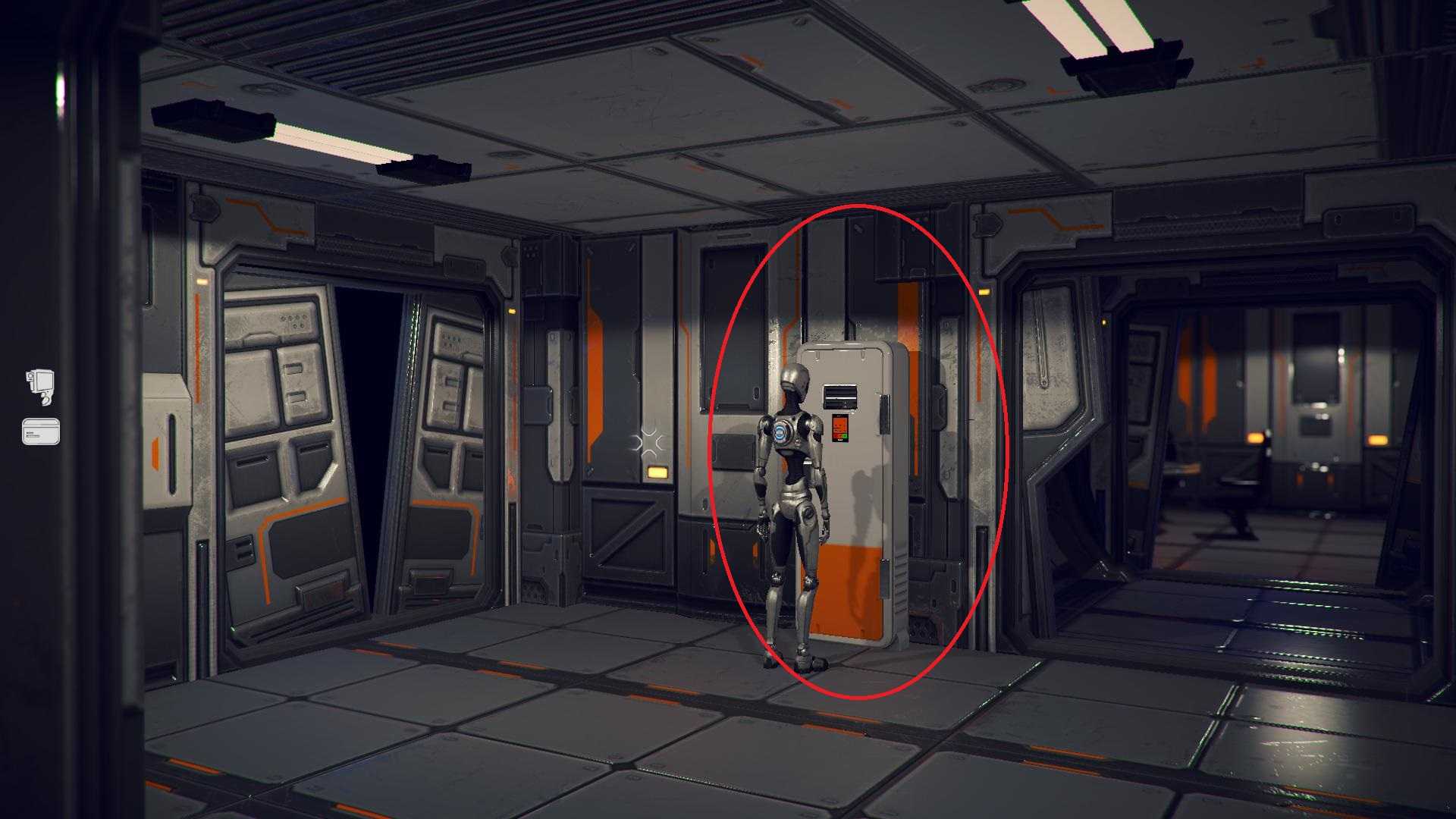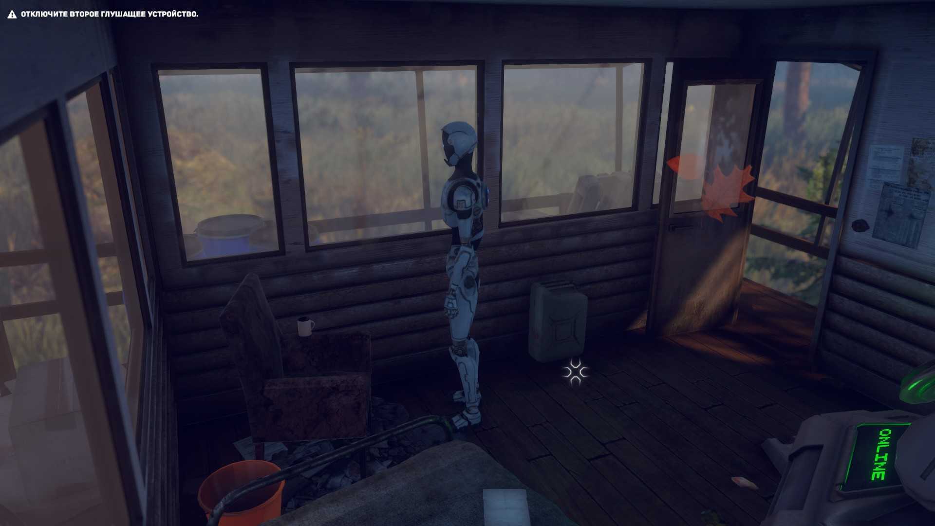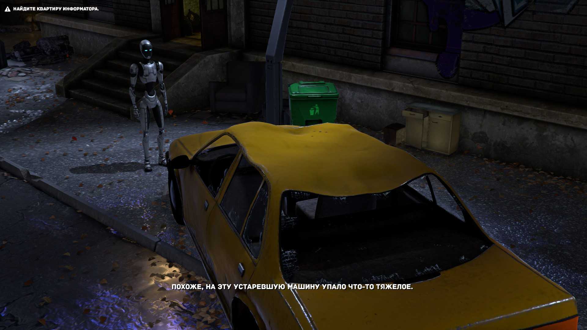 Вскоре вы окажетесь у дома информатора – полицейского робота F-2. Пройдите внутрь дома и поднимитесь на второй этаж. Видите опечатанную дверь? Изучите её, выберите все иконки. Использовать резак нельзя, поскольку сработает сигнализация.