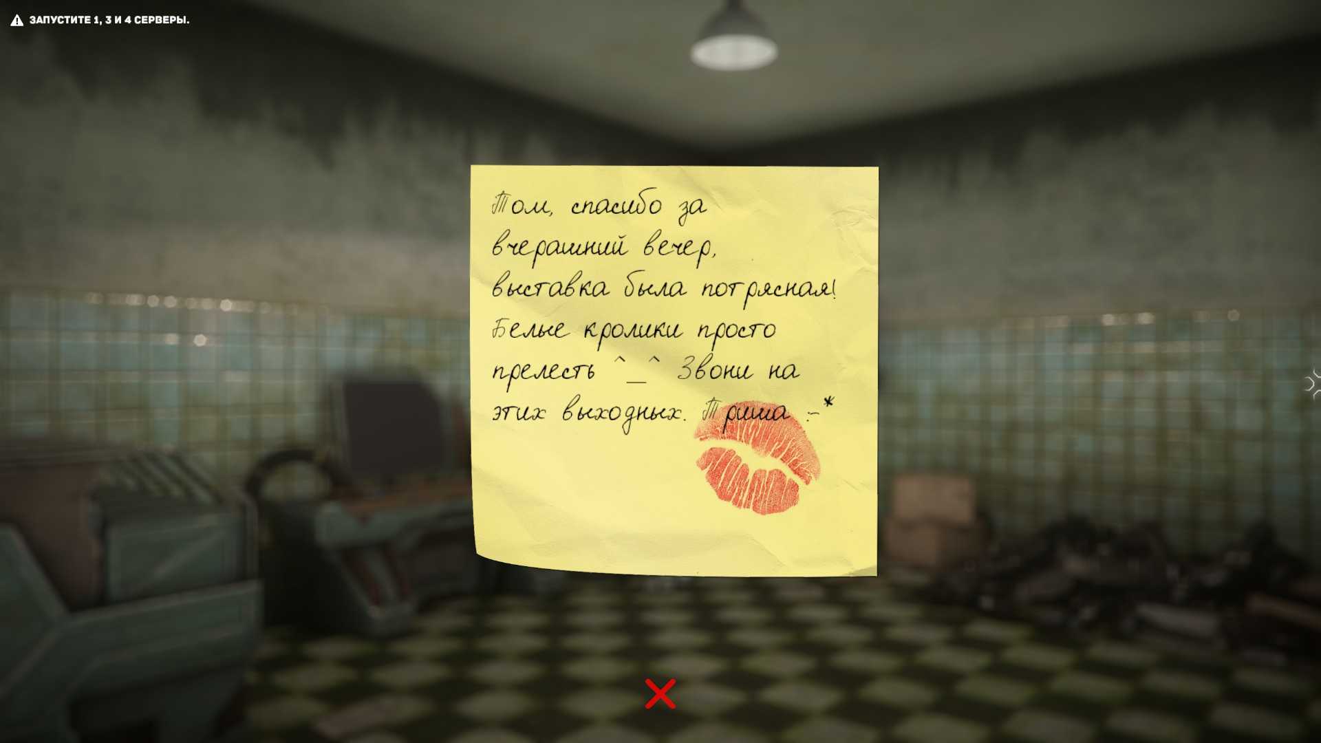 b) Записка под маршрутизатором в серверной. Это любовная записка от Триши некому Тому, где она его благодарит за выставку с “белыми кроликами”. Эта пасхалка не ясна. В сериале “Остаться в живых” часто фигурируют белые кролики, есть персонажи Триша и Том, но связи я не увидел. Так же возможна отсылка к немецкому триллеру 2016 года “Белый Кролик”, сюжет которого вертится вокруг интернет-знакомств подростков, на что нас подталкивает серверная и маршрутизатор, но имен я таких там не нашел, увы.