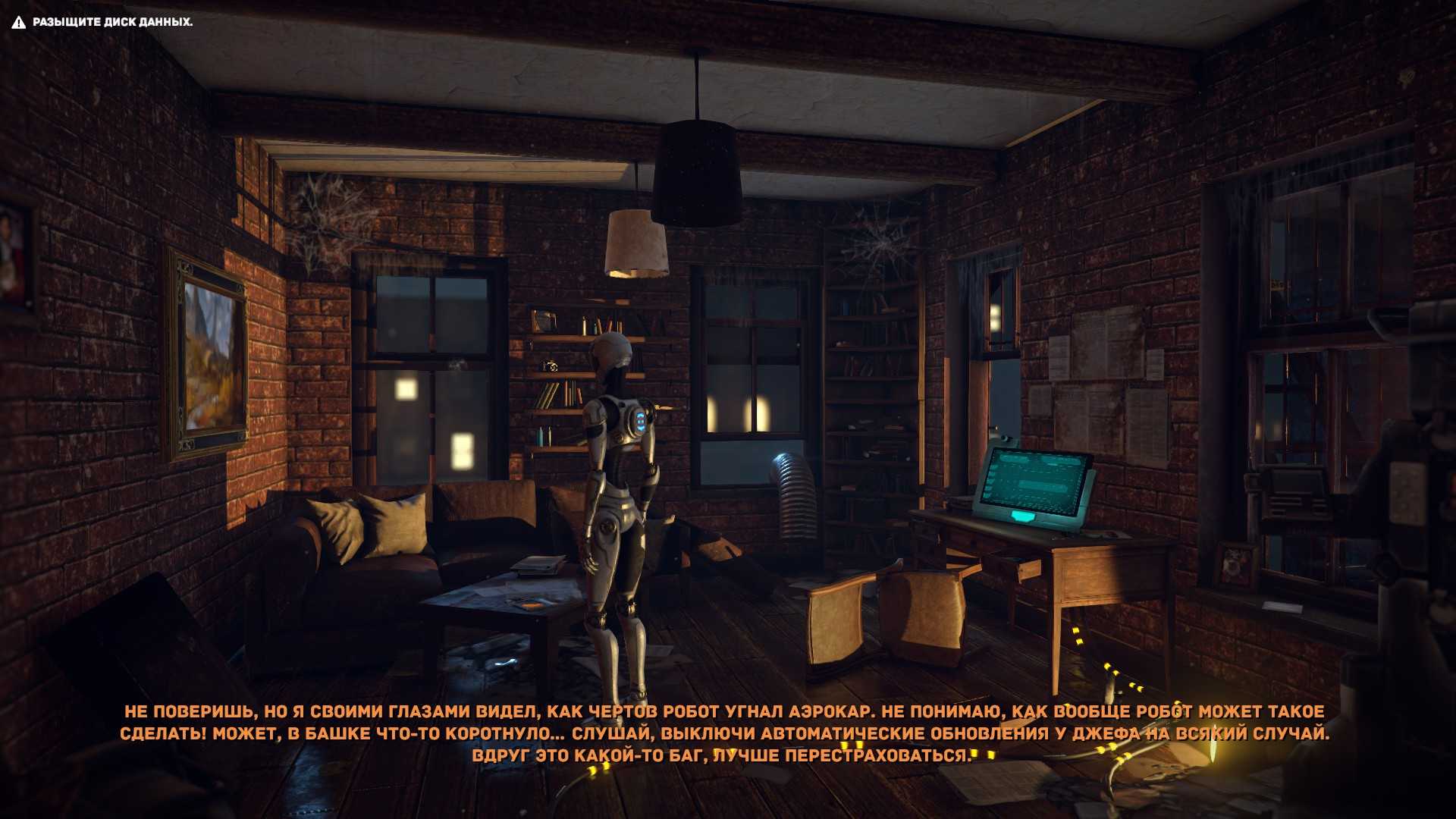 After rising to the second floor, watch the video. Leave the room with your comrades, take the elevator downstairs and enter the set. Examine the first floor, then go up the stairs and interact with Thompson’s locker. Enter the standard password 1—2—3—4—5, take the key from the aircar.