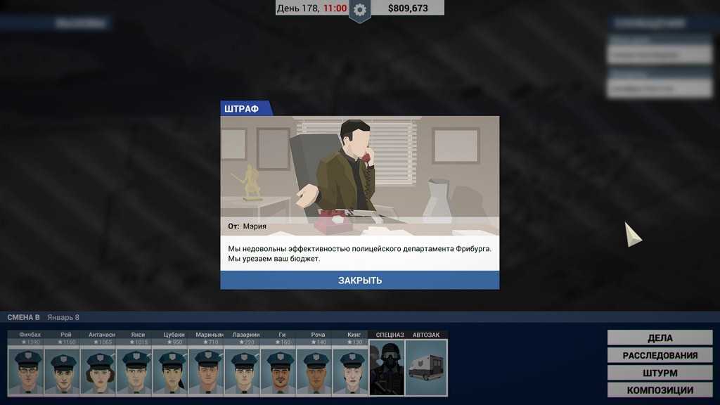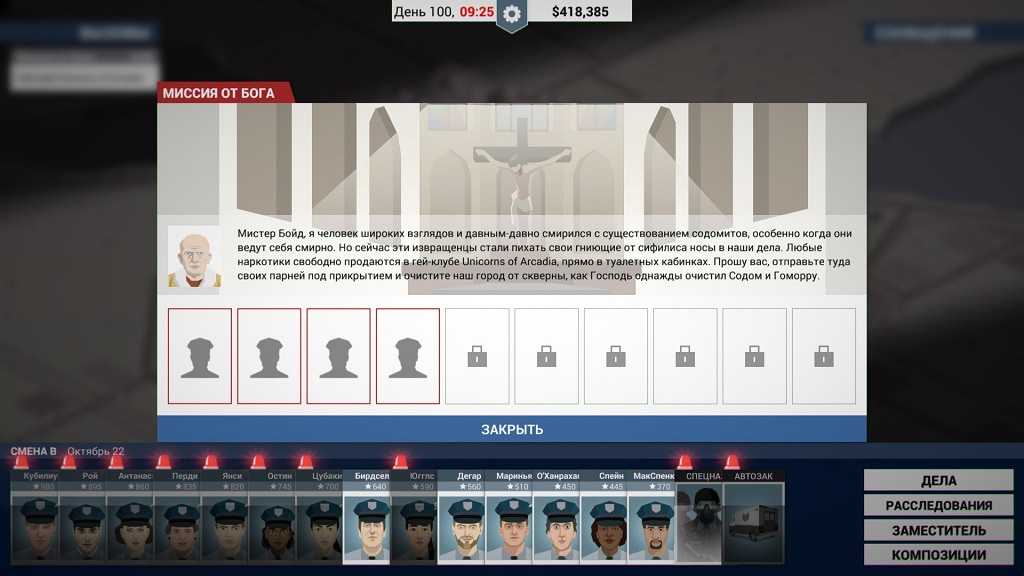 Этот элемент очень оживляет геймплей This Is the Police 2. Миссии можно проходить множество раз, но огорчает то, что нельзя заменить копа в отряде, приходится полностью перепроходить день, чтобы взять нужного бойца в отряд.