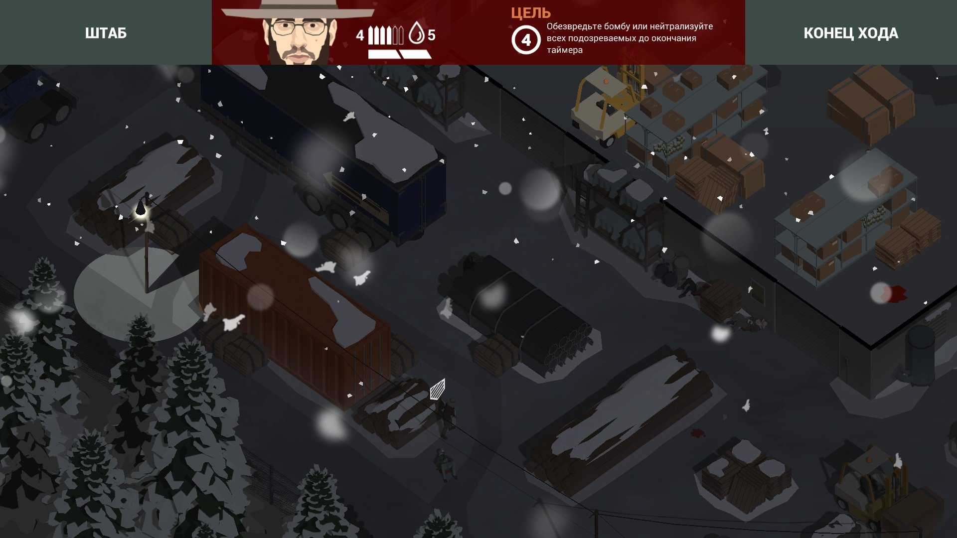 На карте расположились тринадцать бандитов, которые грозятся взорвать все к чертям. Взрывное устройство находится в одном из помещений склада, но обезвреживать его совсем не обязательно, достаточно ликвидировать всех врагов. Вам нужно успеть выполнить операцию за 10 ходов.