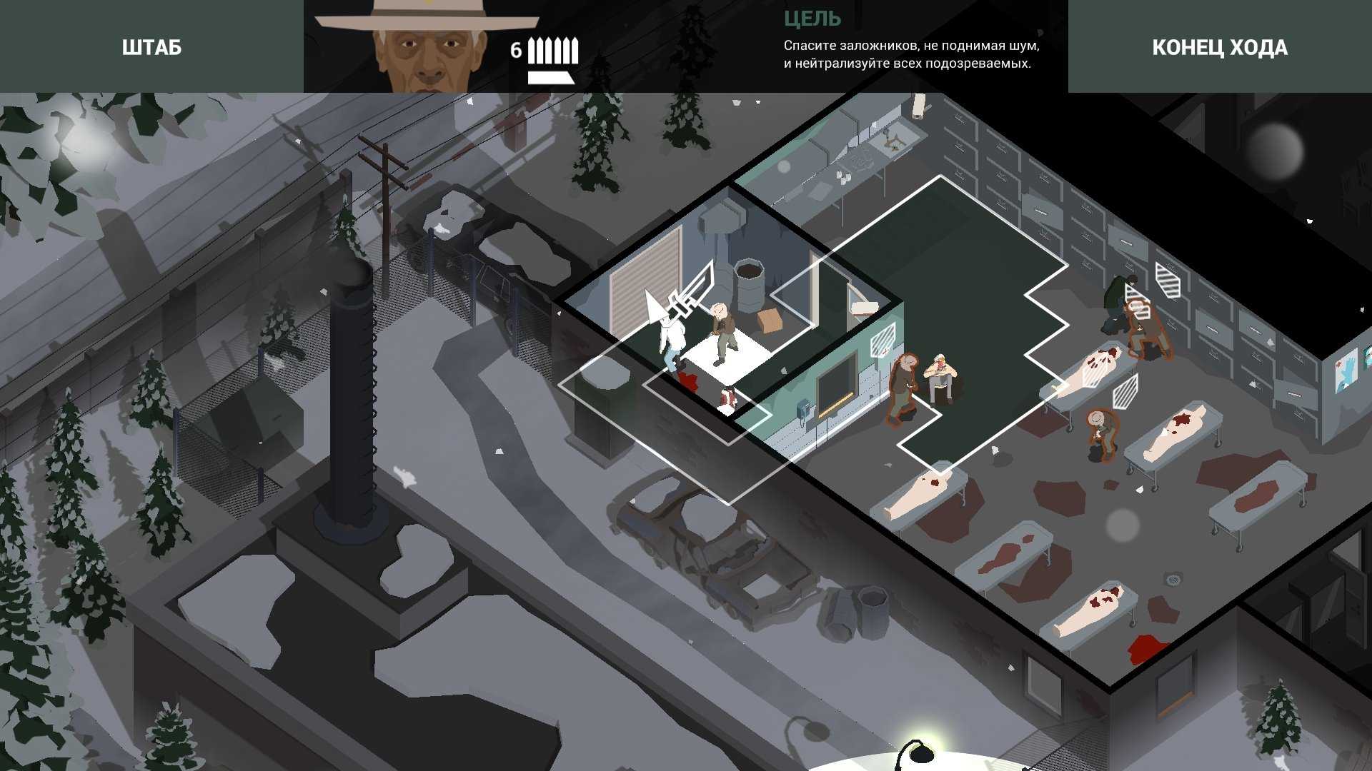 - Выстрелите в противника из револьвера. На выбор дается четыре части тела: голова, грудь, руки и ноги. Прострелив врагу голову, он тут же погибнет. Если ранить оппонента в грудь или ногу, то он не сможет полноценно производить действия и умрет через несколько ходов от потери крови. Выстрел в руку не обездвижит преступника, но он уже не сможет отбиваться от полицейских. При любом выстреле (кроме бесшумного) сразу будет поднята тревога!