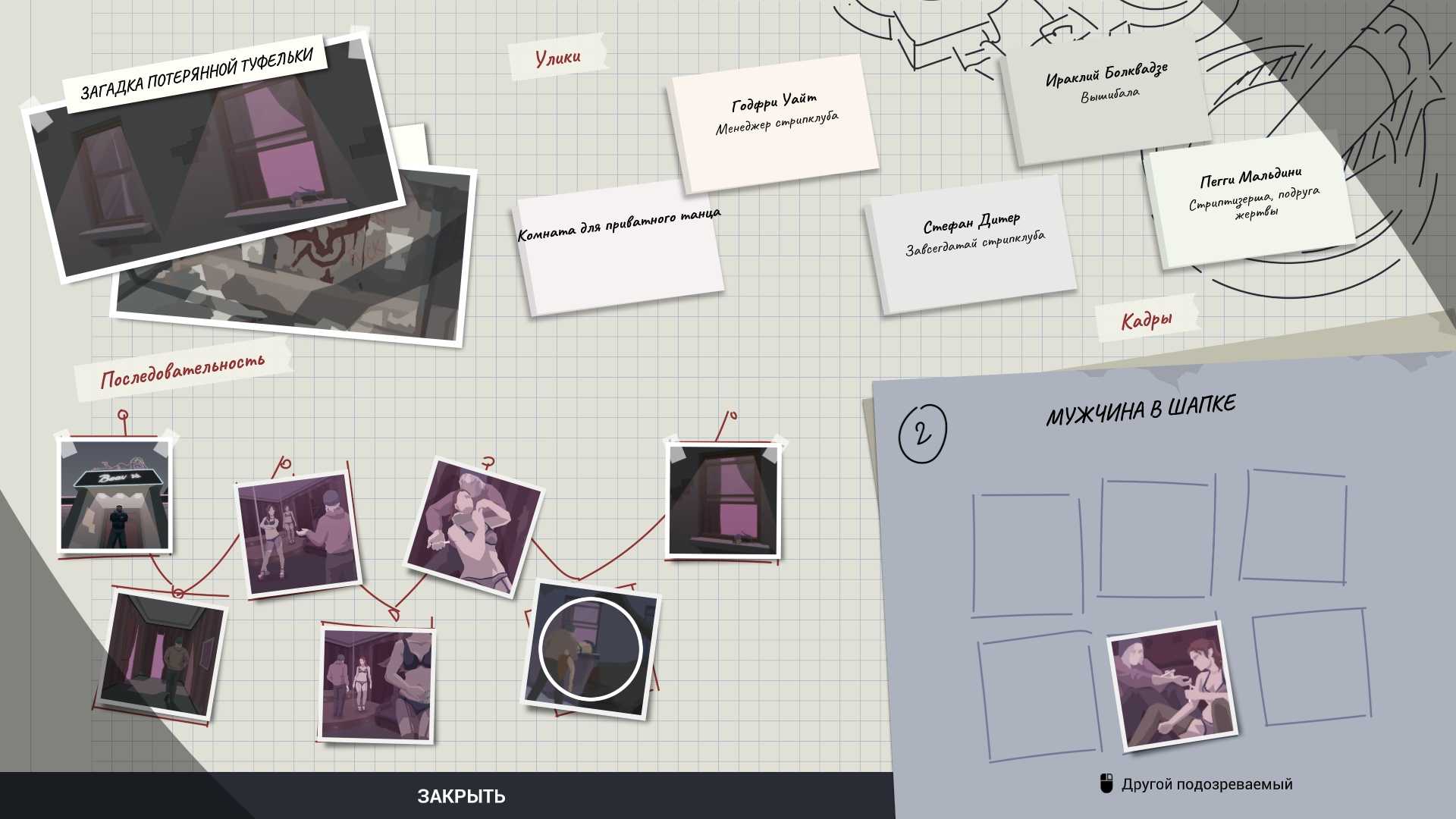 Что касается расследований детективов, то базовый процесс примерно такой же, только детективы на деле остаются все это время. Они находят улики в виде фотографий, а игрок их складывает в нужном порядке, читая описания к делу и комментарии свидетелей.