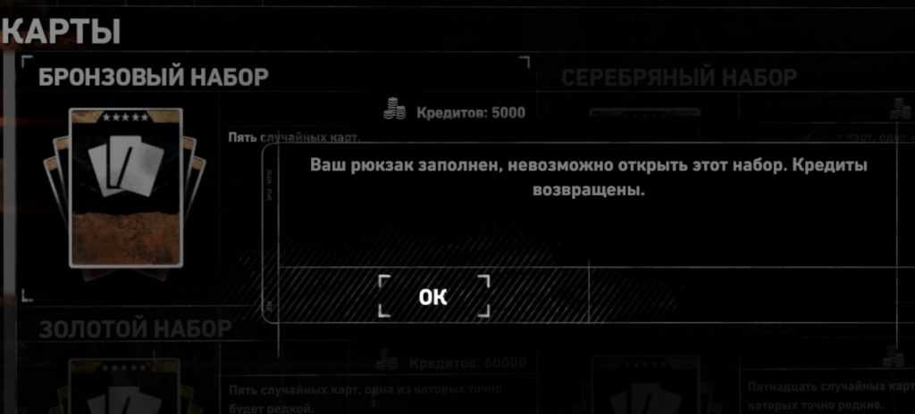 Когда вы достигнете максимального количества карт, вы не сможете больше получить новые карты. При покупке карточного набора будет появляться надпись, что ваш рюкзак заполнен и набор карт невозможно открыть: