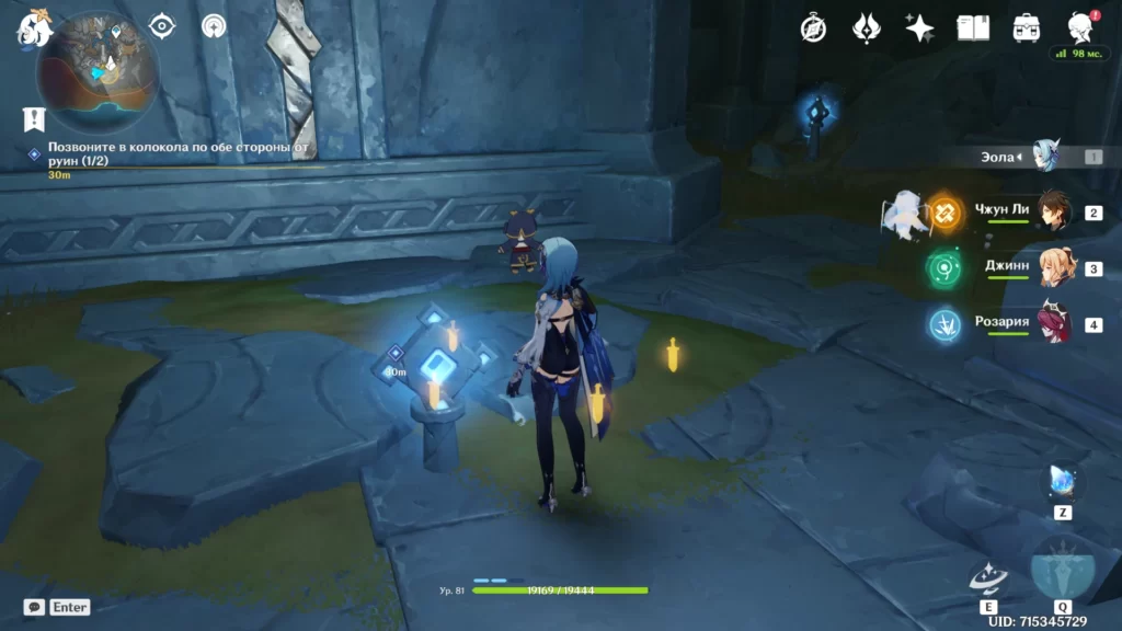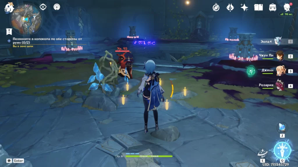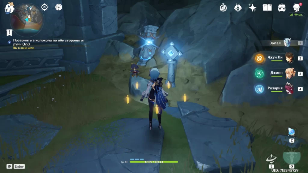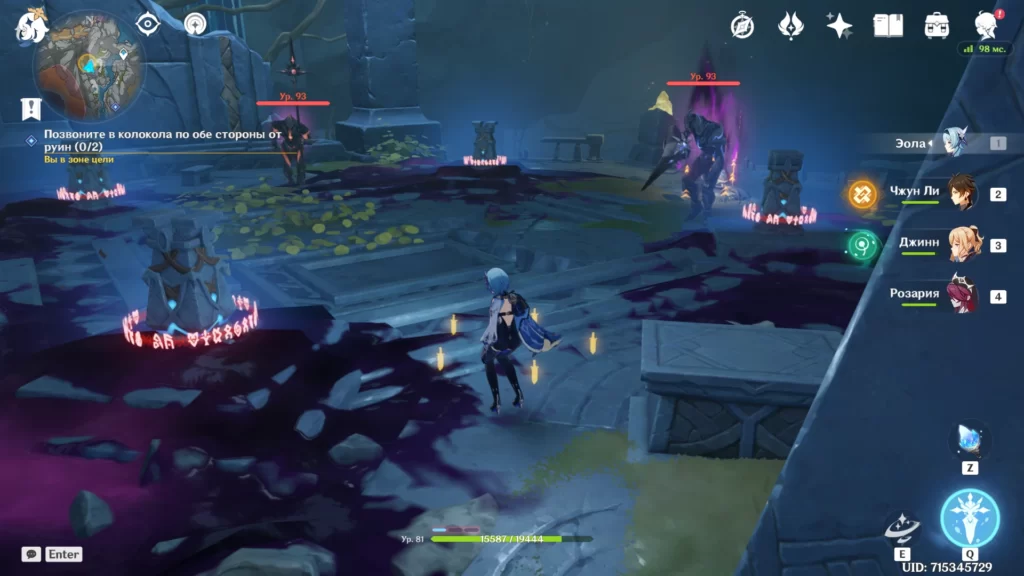 После победы подходим к колоколу и звоним. Возвращаемся к черному туману, из него выйдут два чтеца бездны (пиро и электро), убиваем их.