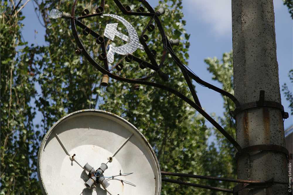 Первое, что встречает человека, заехавшего в центр серп с молотом на столбе (привет, , , , и !).