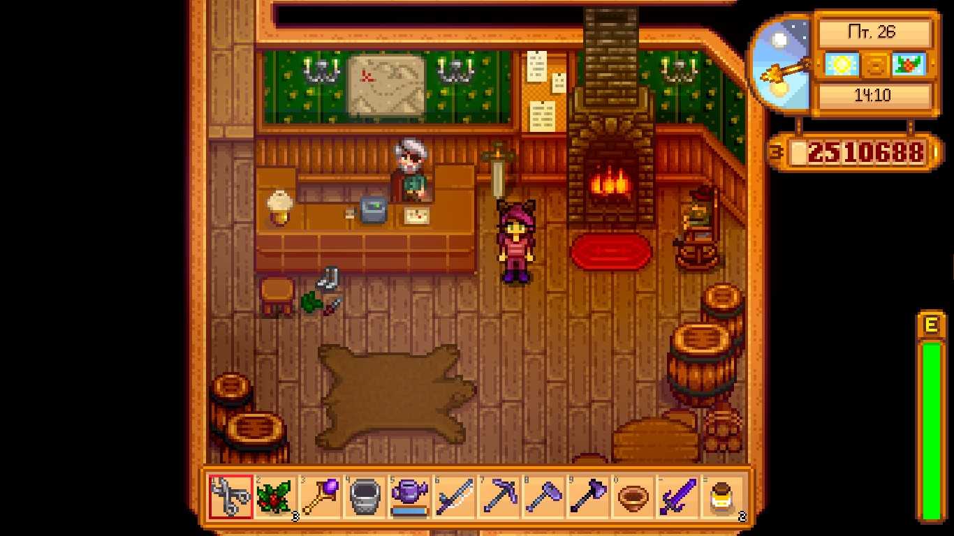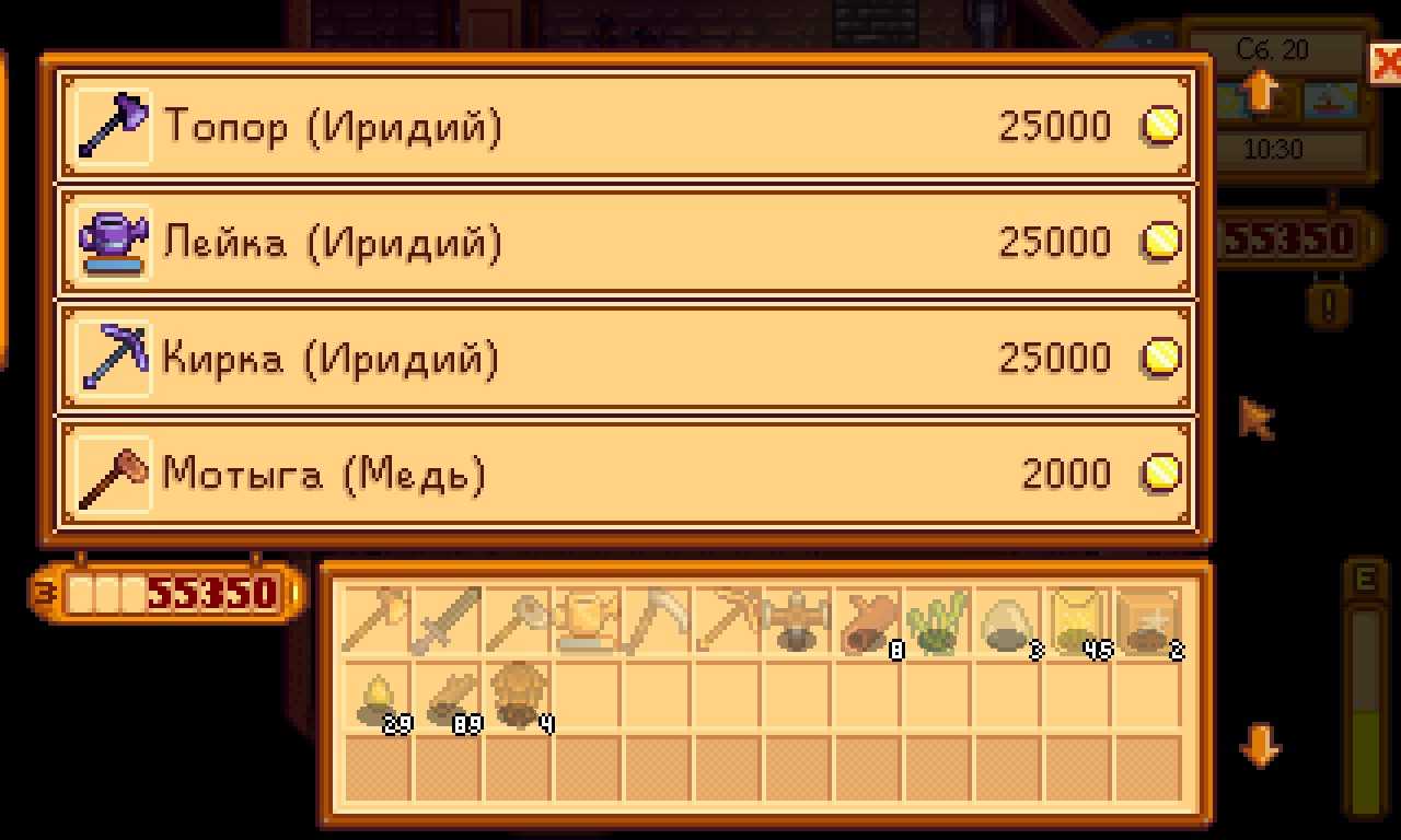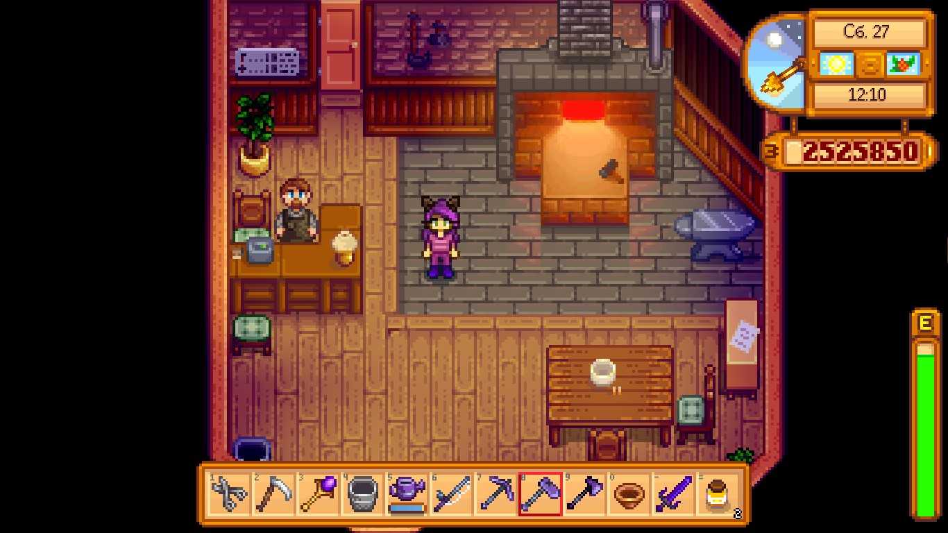 Кузнец Клинт – это NPC, у которого Вы сможете улучшить четыре основных инструмента хозяйства – лейку, кирку, топор и мотыгу. Первым же делом грейдите их в любой последовательности (для этого нужны слитки металла и золото), так как в их улучшенном виде Вы будете быстрее работать и меньше тратить жизненно важную энергию.