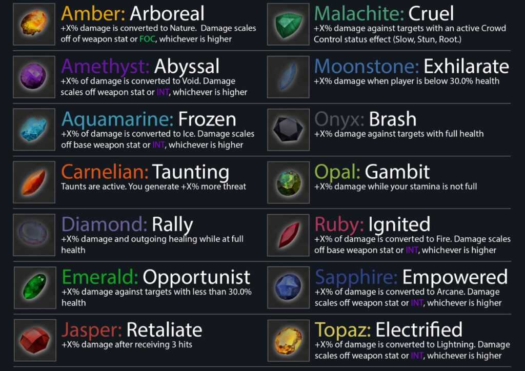 Carnelian: активирует таунты способностей, и повышает ваш процент генерации аггро. Крайне полезный гем для танков