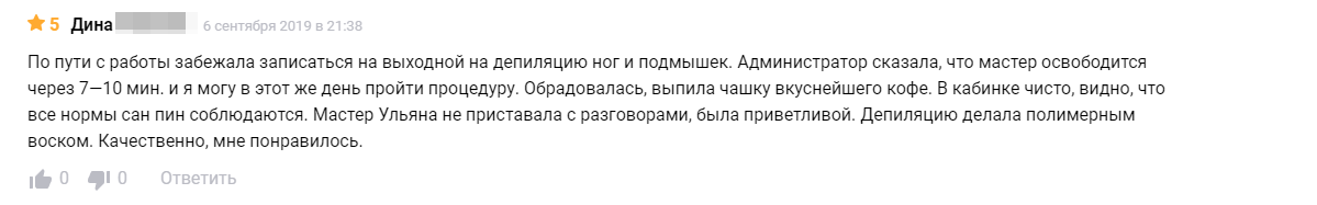 В случае с отзывом про депиляцию, ответов на комментарий Дины может быть пять. Для примера приведем два варианта.