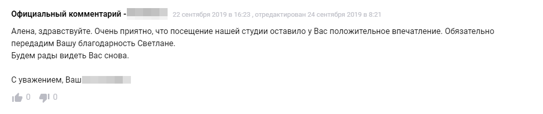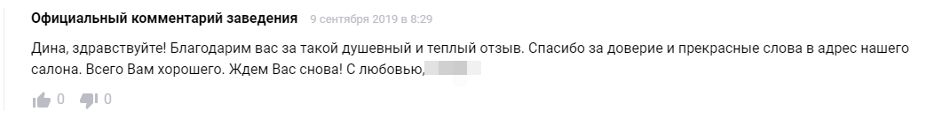 «Здравствуйте! И вам спасибо за ваш отзыв. Приходите к нам еще» – примерно так выглядит 90% ответов на положительные отзывы.