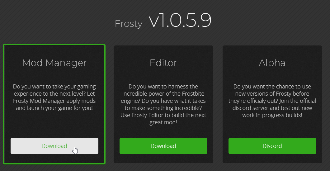 Для начала скачиваем Frosty Mod Manager с официального сайта (не Editor):