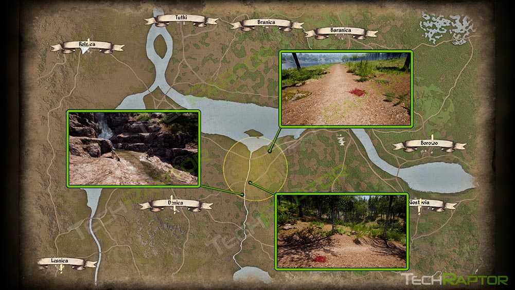 Вам нужно будет уметь видеть, поэтому убедитесь, что вы путешествуете в дневное время. Двигайтесь на юго-восток в направлении области, отмеченной желтым кругом. В этом районе есть две основные дороги; какую бы дорогу вы ни выбрали, в конце концов вы столкнетесь с пятном крови — верный признак неприятностей.