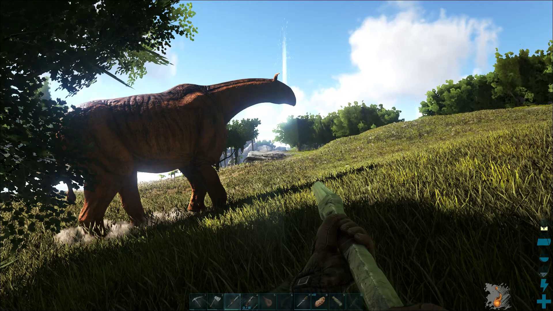 Чтобы приручить динозавра, вы теряете его в бессознательном состоянии и даете ему пищу, чтобы вернуть его к здоровью — я думаю, у динозавров короткая память. Приручение вашего первого питомца — это действительно классный опыт. Хотя немного скучно стоять и смотреть, как просыпается спящий динозавр, это занимает всего несколько минут. В Арке очень здорово иметь питомца, и удивительно, как быстро я сблизился со своими друзьями-динозаврами. Я приручил своего первого хищника, назвал его в честь моей собаки (естественно), а затем мы с хищником отправились на охоту. Ранение моего карьера стрелой и наблюдение за тем, как мой хищник преследует и убивает его, сопровождалось радостным чувством дружбы и силы.