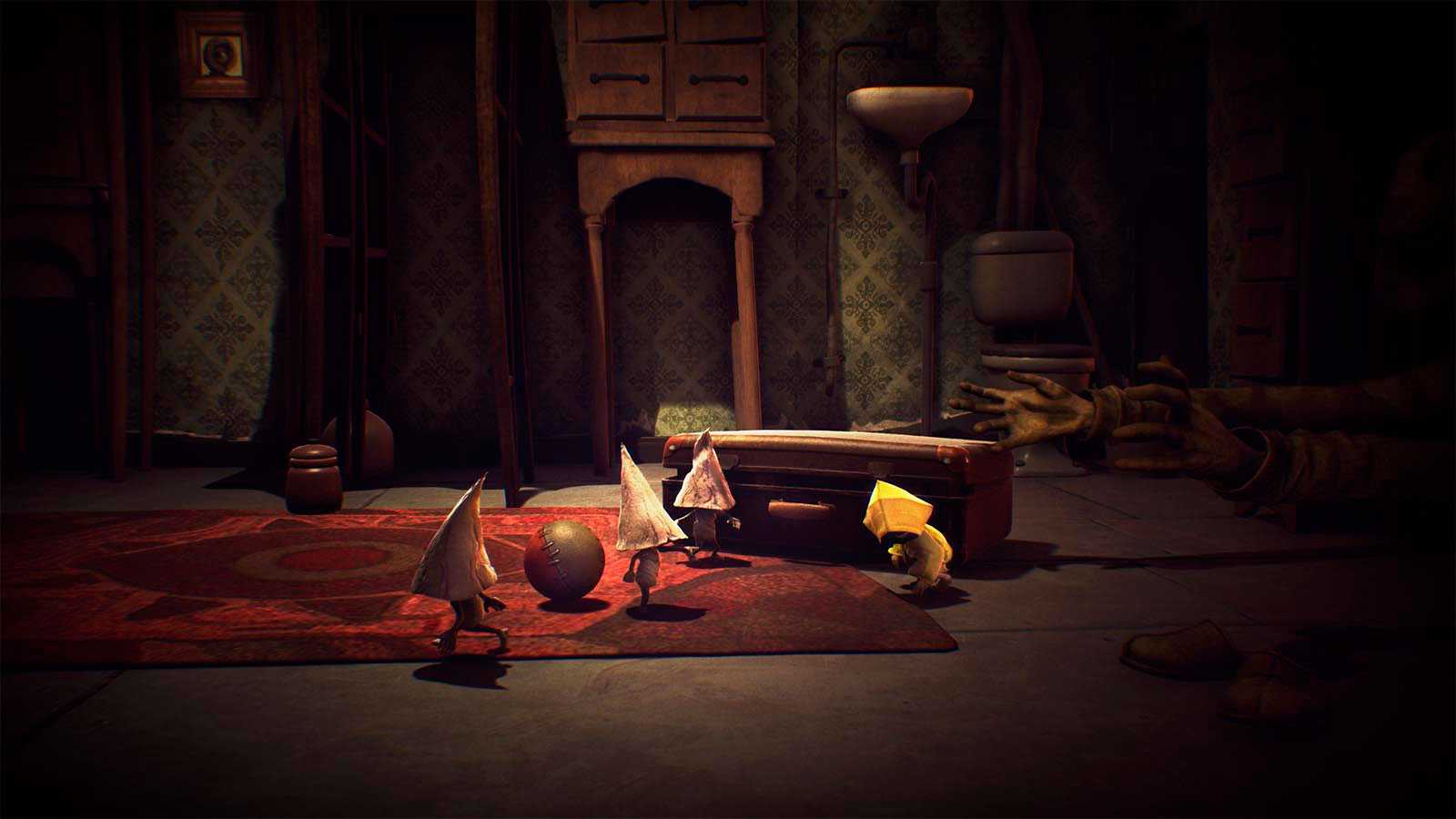 Главная героиня, маленькая девочка по имени Шестая в ярко-желтом дождевике, просыпается в чемодане в странном и жутковатом месте, которое разработчики называют Чрево. При себе у нее зажигалка, с помощью которой можно зажигать лампы и делать сейвы (автосохранение тоже есть), ну и бороться с непроглядной местами темнотой. Само Чрево устроено, как водится, парадоксально, но мир проработан с такой тщательностью, что исследование его приносит даже больше удовольствия, чем решение интуитивных головоломок или улепетывание от врагов. Что за глаза в дверях и на решетках окон, напоминающие Билла Сайфера из Графити Фоллз? Черные следы детских ручек и ножек, прямо как в трейлере Death Stranding? Что-то общее ближе к концу угадывается и с «Унесенными призраками» Миядзаки, и с произведениями Франца Кафки.