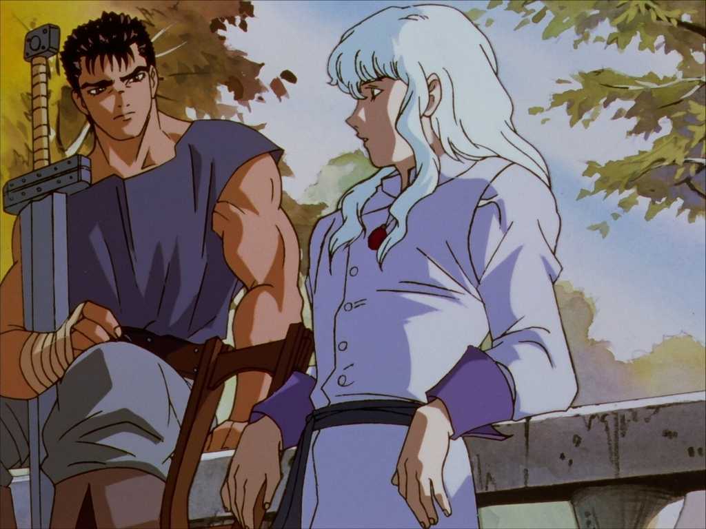 Берсерк рассказывает историю встречи Гатса и Гриффита, лидера отряда соколов, банды наемников на жалованье королевства Мидленд. Из этой встречи родится двусмысленная дружба, но тем не менее эффективная: присутствие Гатса, воина с непропорциональным мечом, быстро окажется необходимым для амбиций молодого Гриффита, головореза и выдающегося тактика. Таким образом, в аниме рассказывается о взлете и падении отряда соколов, а также об отношениях между Гуком и Гриффитом, особенно сложных, между отношениями интересов (Гриффит использует силу Внутренностей), взаимным уважением (оба видят друг друга как солдат. ) и глубокая привязанность (каждый необъяснимо нуждается в присутствии другого).