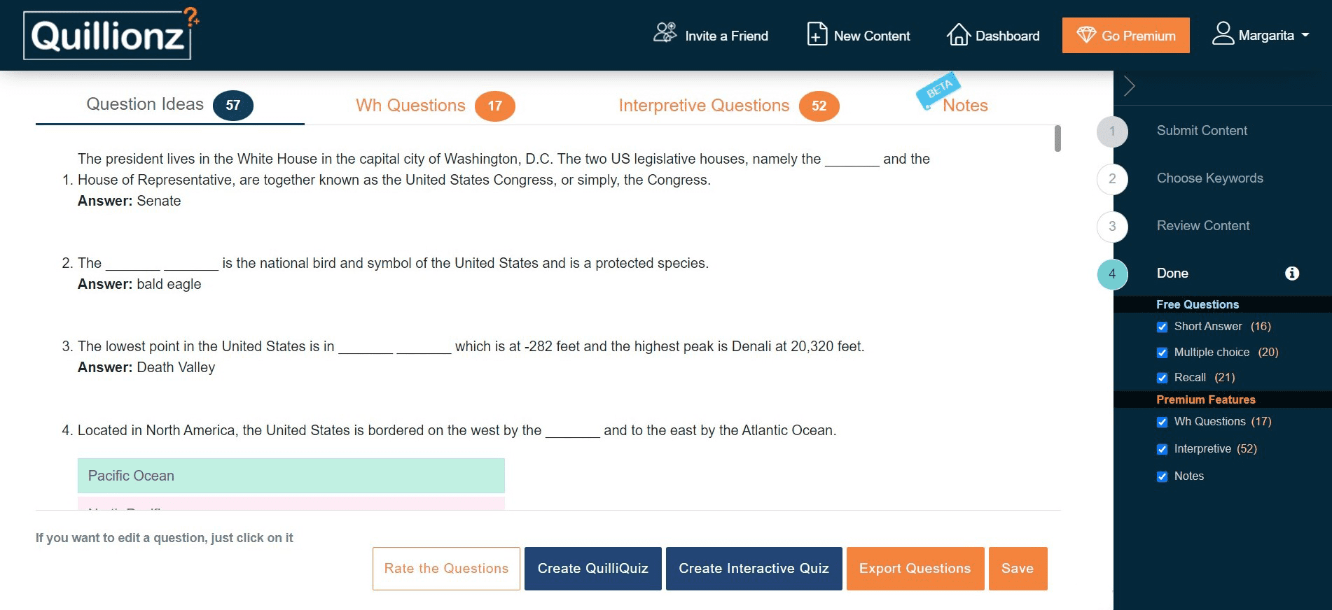 Все эти функции доступны бесплатно. При приобретении Pro-тарифа генерируются более качественные вопросы, основанные на описании процессов и нахождении причинно-следственных связей, за меньшее время. Также вы сможете использовать тексты в PDF и экспортировать вопросы в .doc, PDF и QTI форматы. Последние подойдут для использования на сайте Moodle.