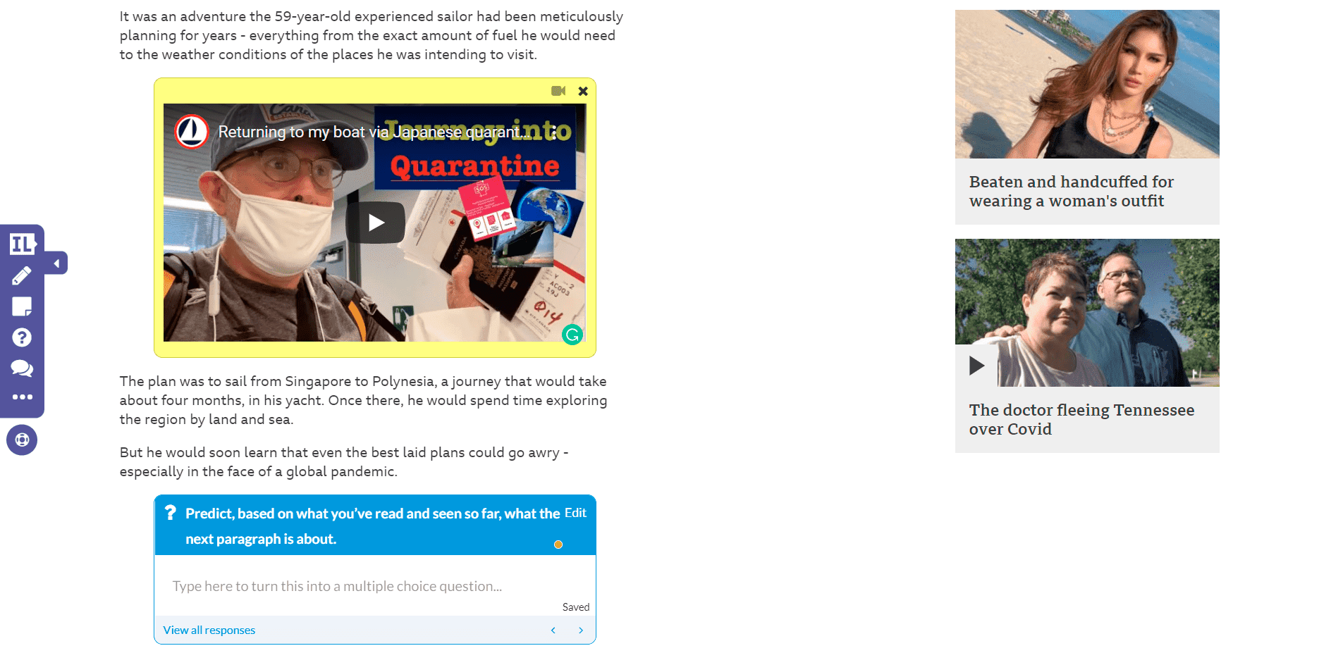 Можно добавить вопросы на понимание прочитанного, ссылки на изображения, видео и различные интерактивные упражнения. Это можно сделать, нажав на иконку, расположенную с левой стороны экрана.