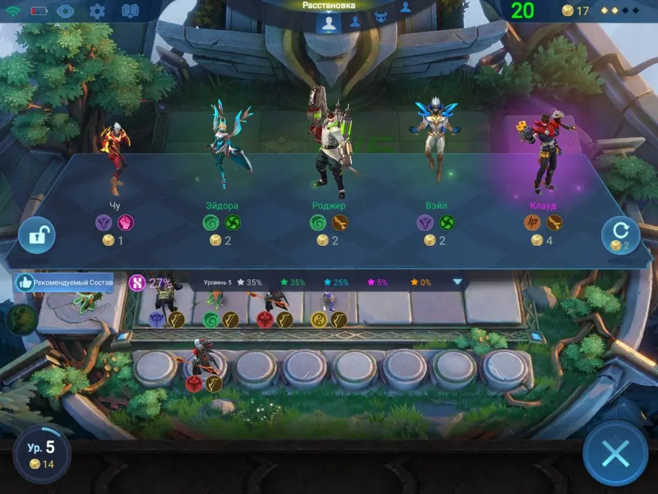 Основной способ покупки юнитов — Магазин. После каждого раунда у вас будет подготовительный этап, на котором Магазин будет автоматически обновляться. Стоимость героя составляет от 1 до 5 золотых монет, а вероятность получения более дорогих персонажей всегда отображается в нижней части магазина. Кроме того, вероятность повышается с увеличением уровня командира.