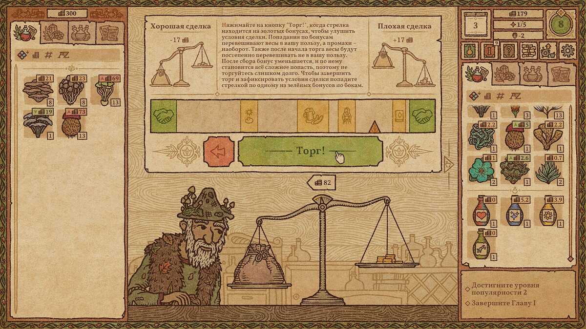 Помимо базовой механики в игре можно торговаться, собирать травы из сада и конструировать алхимическую машинуПомимо базовой механики в игре можно торговаться, собирать травы из сада и конструировать алхимическую машину