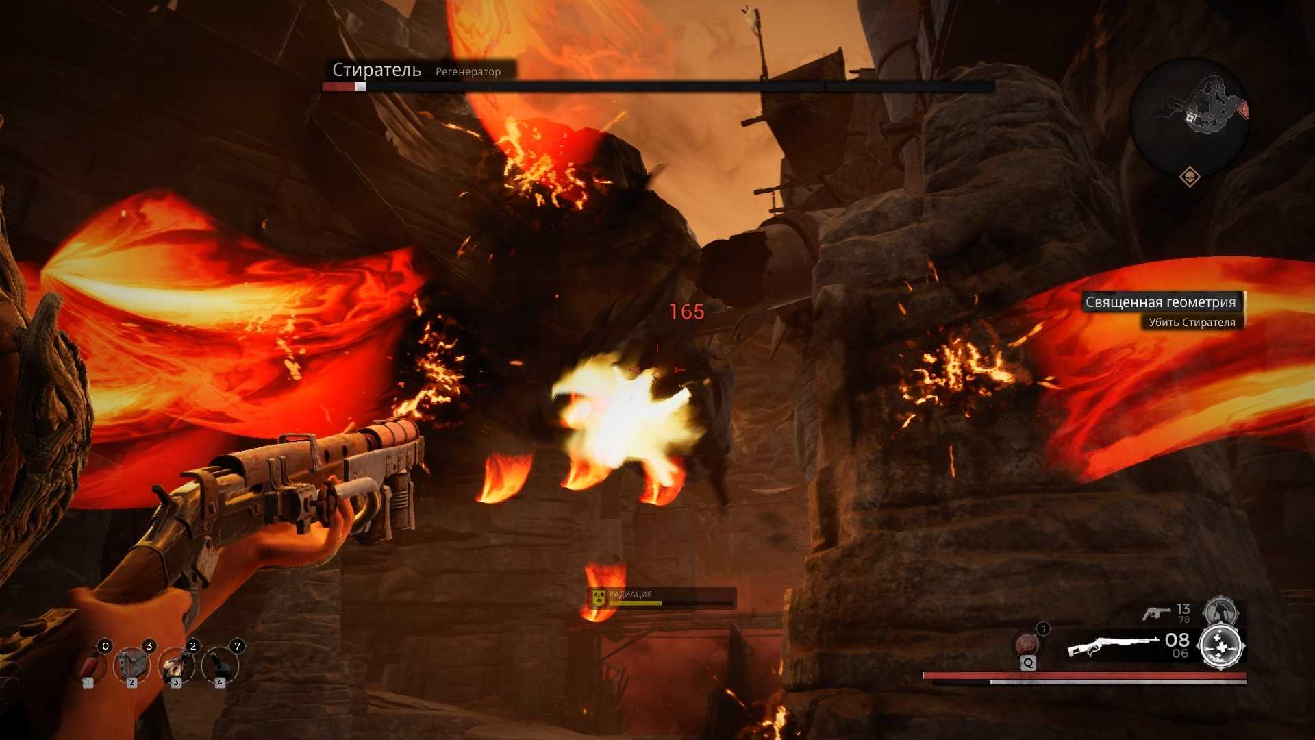 Когда босс появится перед вами — стреляйте в светящееся место, откуда он выпускает огонь. Такие выстрелы будут наносить критический урон и позволят быстрее завершить битву. Не забывайте про уничтожение его приспешников — обычных и радиоактивных летающих черепов. Когда Стиратель начнет атаковать огнем, мы рекомендуем не прятаться, а стрелять в ответ. Так как вы запаслись жидким хладогентом, то в любой момент можете остановить горение.