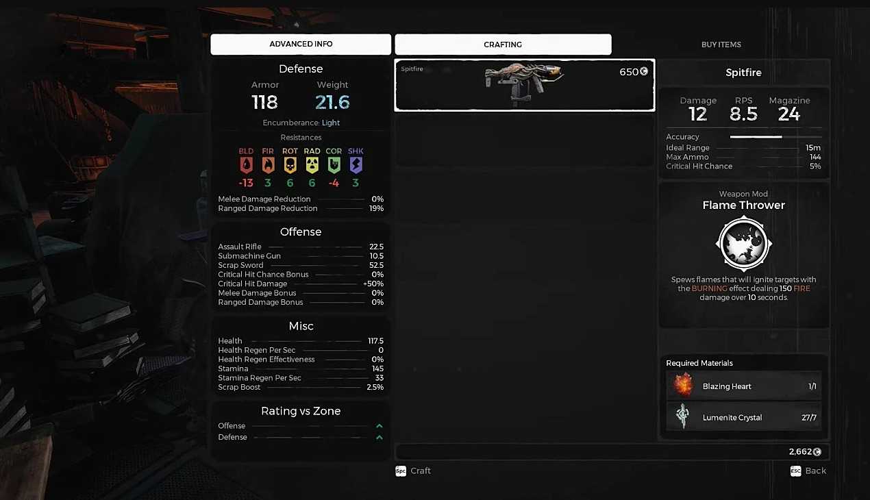 Вулкан — футуристическая штурмовая винтовка. На нее можно установить улучшение — огнемет. Это позволит наносить дополнительно 150 урона. Чтобы создать это оружие, вам понадобится материал под названием «Пылающее Сердце» и семь Люминитовых кристаллов. Первое можно выбить с босса Ожога, который находится на Земле. Второе продается в 13 блоке у Элиссы.