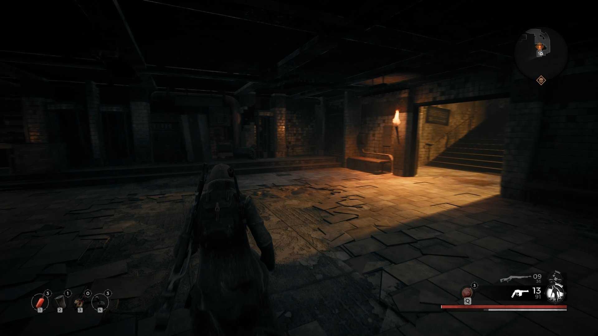 После сражения с Невольником обязательно посетите Блок 13, чтобы пополнить запасы зелий, а также коробок с патронами. В схватке со следующими боссами не будет обычных врагов, поэтому патроны вам пригодятся. На следующей локации держитесь правой стороны, затем спуститесь в подземелье. Подберите несколько коробок с патронами, которые лежат перед входом и выходите на мост.