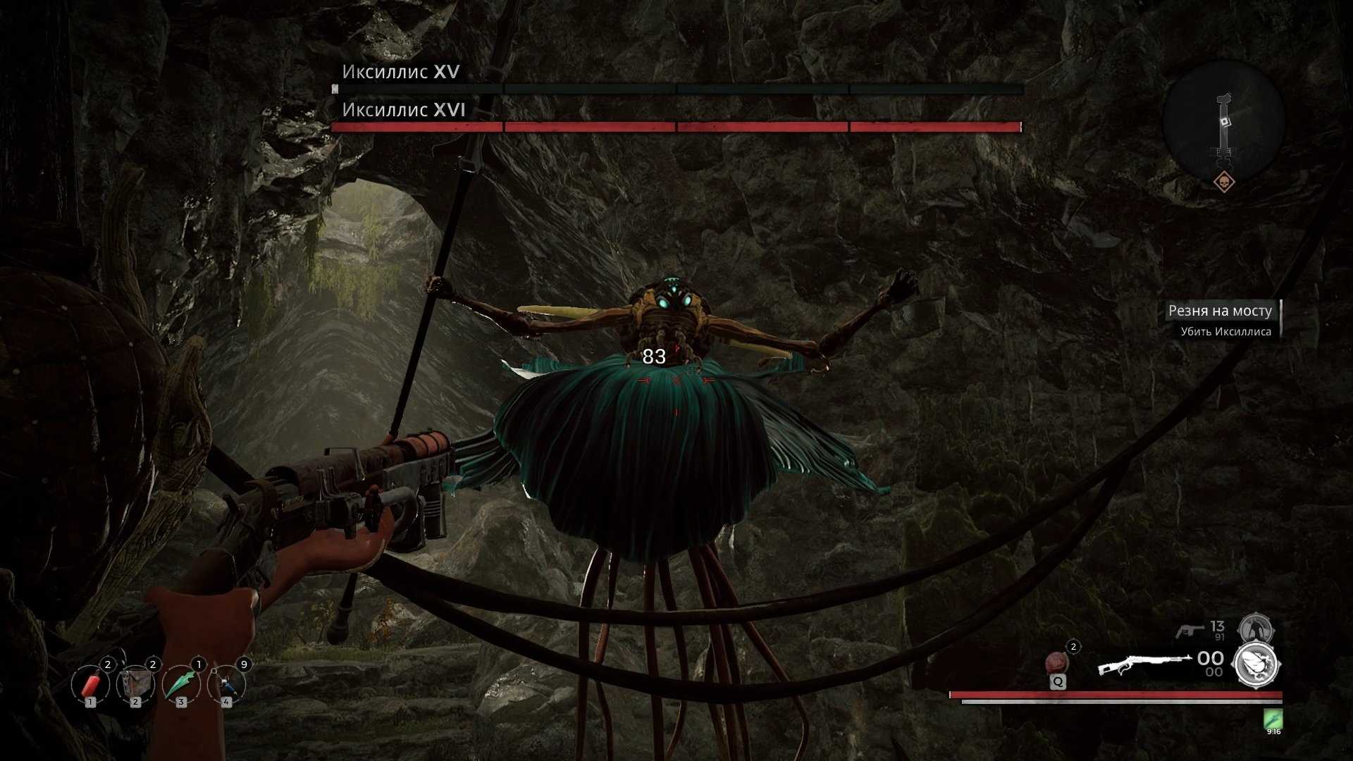 Когда вы окажетесь на мосту, противник будет всего один. Стреляйте ему в голову и уворачивайтесь от ударов копьем, а также от взрывающихся бомб. После серии ударов босс призовет летающие шары, которые наносят небольшой урон. Их можно ликвидировать выстрелами пистолета, чтобы сэкономить патроны на основном оружии. Бой станет по-настоящему сложным, когда с другой стороны моста появится второй противник — Иксиллис XVI.