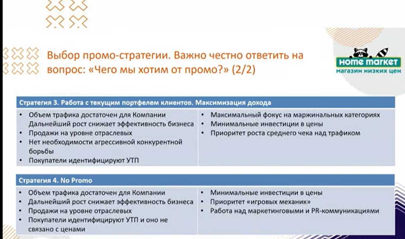 Отказ от промоактивности – это тоже стратегия. Более того, она для ряда компаний может оказаться предпочтительной. В каких случаях о ней стоит задуматься? Во-первых, объем трафика должен быть достаточным для компании, а дальнейший его рост снижает эффективность бизнеса. Во-вторых, продажи у таких компаний должны находиться на уровне отраслевых. В-третьих, покупатели таких магазинов четко идентифицируют уникальные товарные предложения, но при этом не связывают их с ценами. Выбрав стратегию отказа от промо, компания все инвестиции, которые могли быть потрачены на снижение цены в промо, направляет в маркетинг и PR. Именно игровые технологии, различные маркетинговые активности и программы становятся приоритетными.