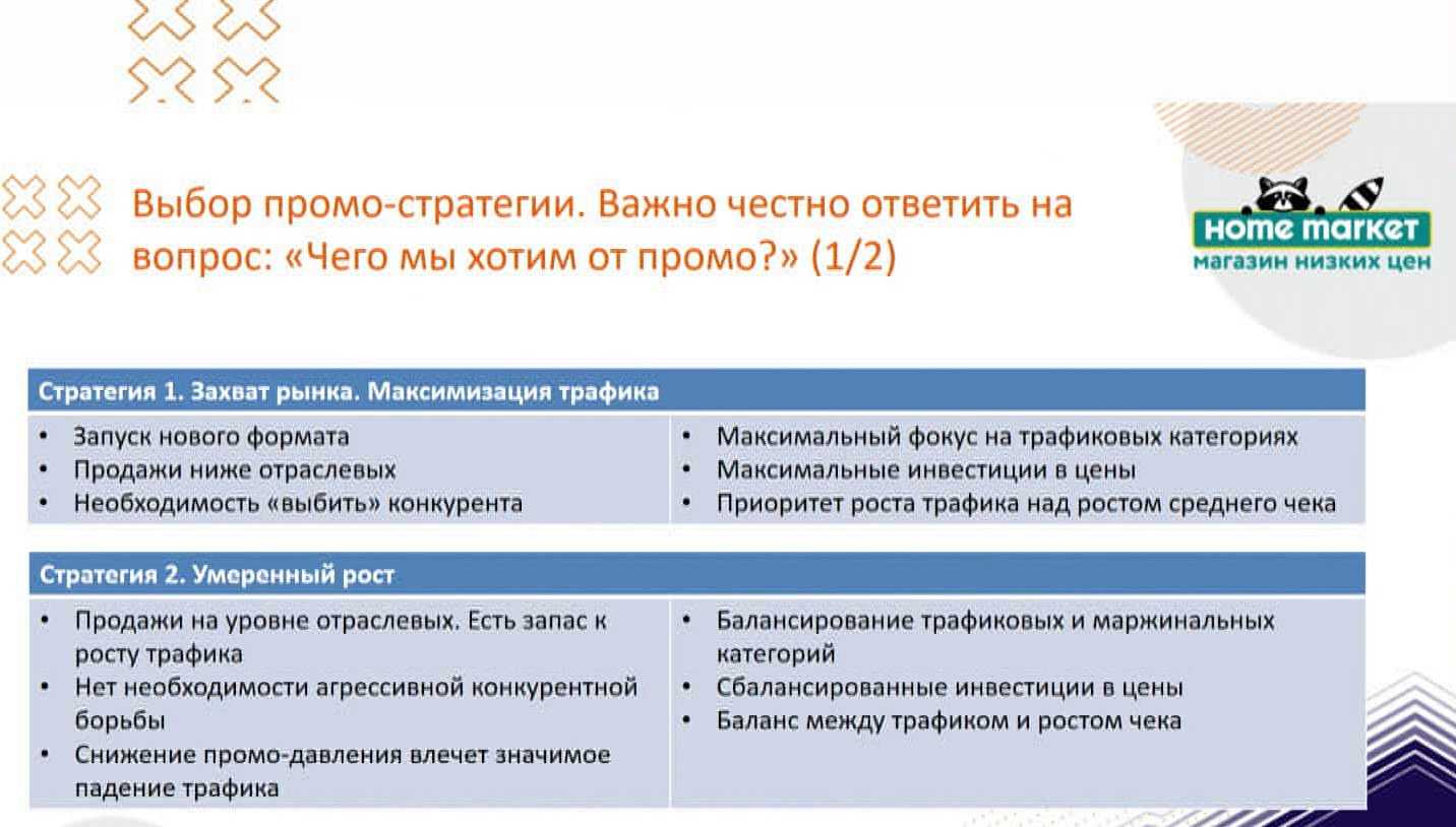 Вторую стратегию, которую использует большинство игроков рынка, можно назвать «умеренный рост». Применяется она в тех случаях, когда магазины работают стабильно, продажи находятся на уровне отраслевых, есть даже небольшой запас по приросту трафика. В этих случаях обычно нет необходимости вести агрессивную конкурентную борьбу. Но при всем этом есть важный нюанс – если вы останавливаете промо, у вас начинается значительное падение трафика. В этих условиях жизненно необходимо поддерживать определенный уровень промоактивности. Соответственно, стратегия умеренного роста предполагает постоянное балансирование между трафиковыми и маржинальными категориями, между трафиком и ростом среднего чека. Данная стратегия предполагает достаточно умеренные инвестиции в маржу.