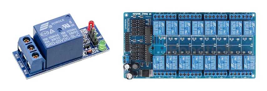 После изучения данного урока вы сами сможете её составить (транзистор и диод), а сейчас мы поговорим о модулях реле: готовая плата, на которой стоит само реле, а также цепи коммутации, защиты и даже оптическая развязка. Такие модули бывают “семейными” – с несколькими реле на борту. Спасибо китайцам за это! Смотрите варианты у меня в каталоге ссылок на Али.