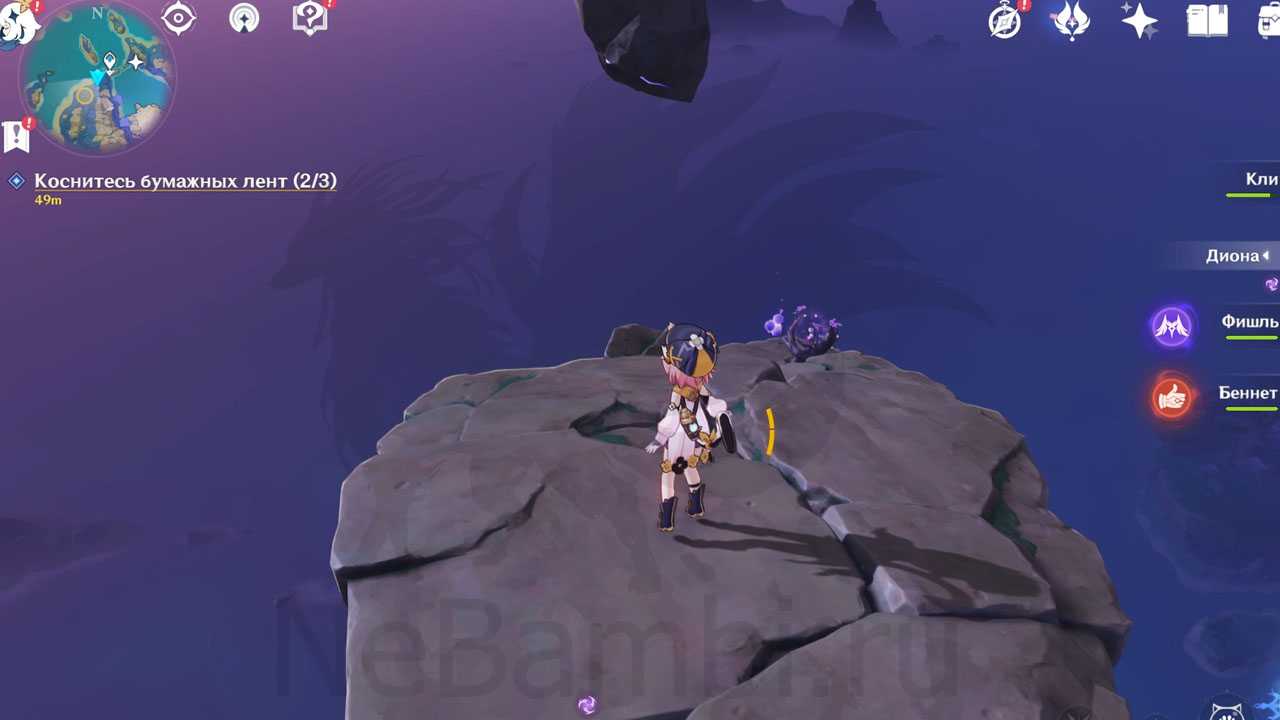 Теперь идите к булыжнику, расположенному неподалеку от Статуи семи. Поведайте искателям приключений о своем опыте. Затем примитесь за решение загадки. Для этого первым делом коснитесь всех 3-х шестов с бумажными лентами, воткнутыми в землю рядом с камнем. Можете коснуться их в любом порядке.