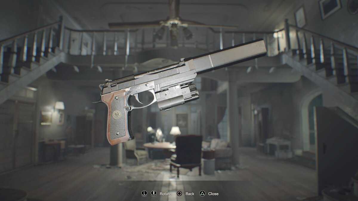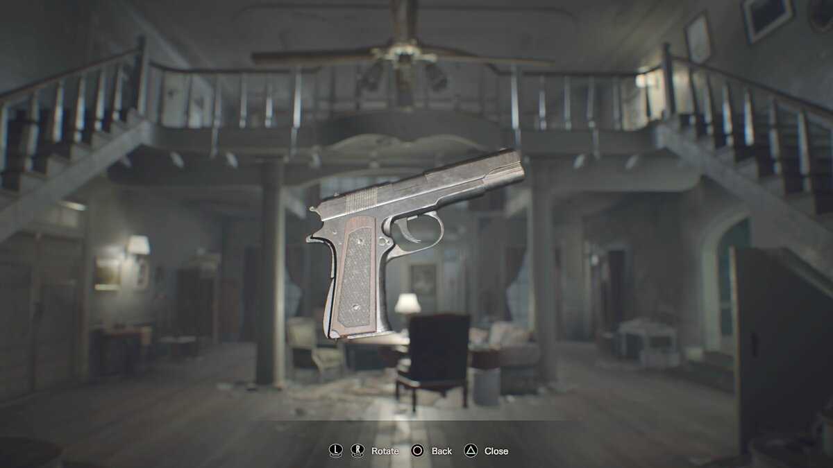 Пистолет M19. Технически именно этот пистолет является первым, которым завладеет игрок по ходу прохождения Resident Evil 7. Затем игрок его теряет, чтобы затем найти его в прицепе, стоящем во дворе, за дверью с тремя собачьими головами.