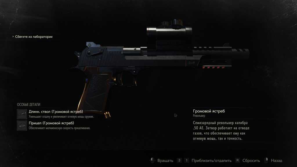 Это самый мощный пистолет в Resident Evil 7, использующий обычные патроны. Плата за невероятную пробивную силу — ограничение на 3 выстрела до перезарядки.