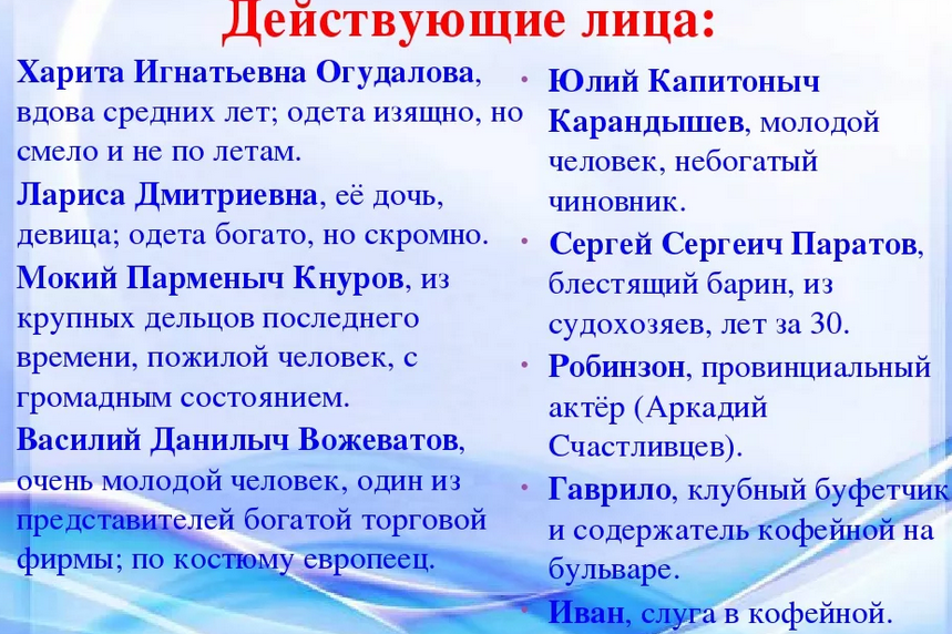 Роль второстепенных персонажей в «Бесприданнице»: мини-сочинение