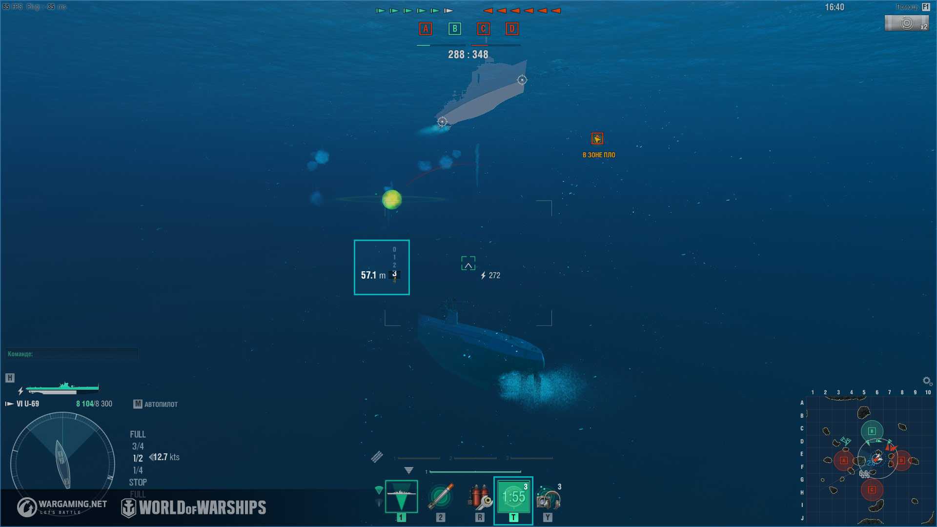 - После выбора акустических импульсов вы увидите два маркера: на носу и корме цели. Прицельтесь в эти маркеры, взяв упреждение, и нажмите на левую кнопку мыши. Учтите, что в отличии от стрельбы, камера не будет сопровождать цель автоматически.